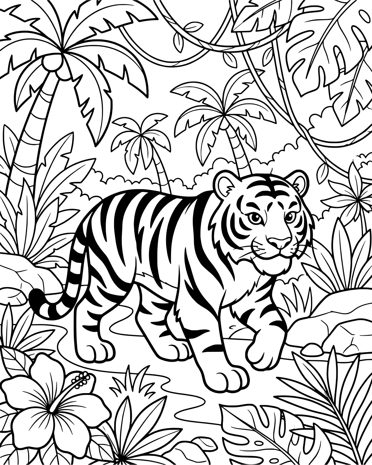 Coloring this scene is a wonderful way to explore the beauty of the wild. The combination of the powerful tiger and the delicate hibiscus flower creates a balanced and interesting picture. Whether you prefer bright, sunny colors or deep, mysterious shades, this jungle scene provides plenty of space to experiment with different combinations.