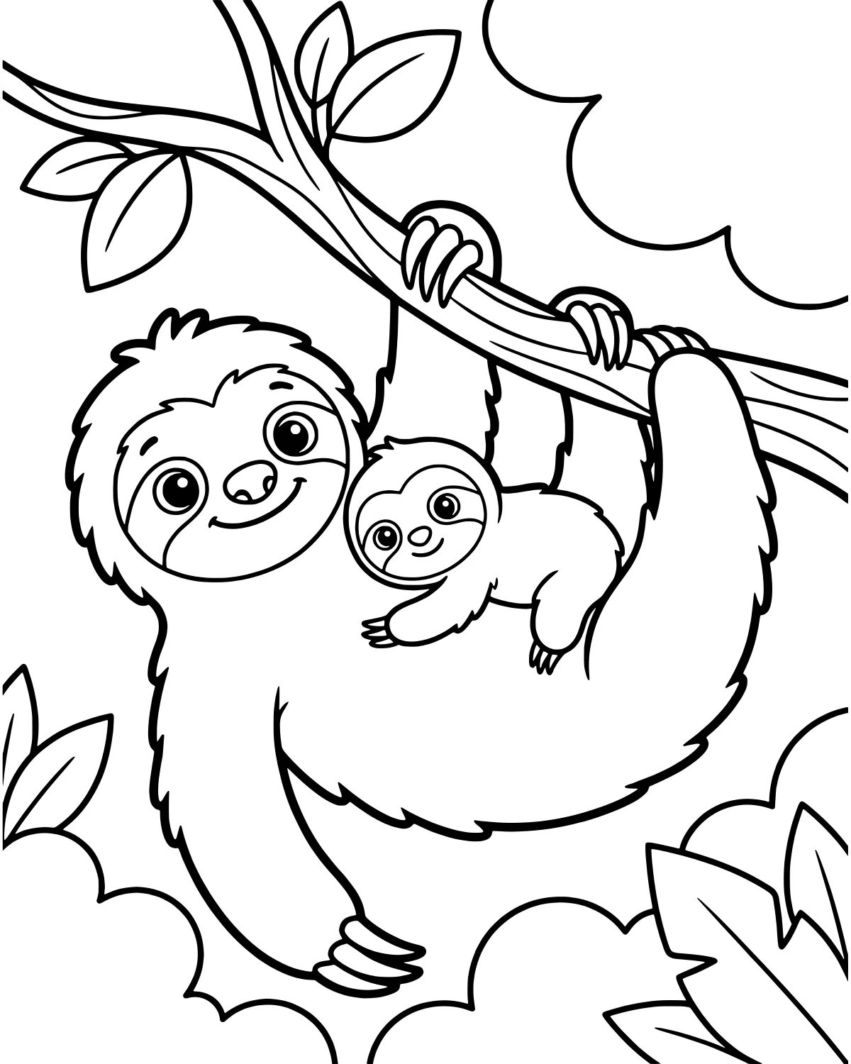 After you finish coloring, try counting all the leaves on the branch to practice your numbers. You can also give the mother and baby sloth names and tell a story about where they are traveling in the jungle. Maybe they are heading to a favorite spot for a long afternoon nap.