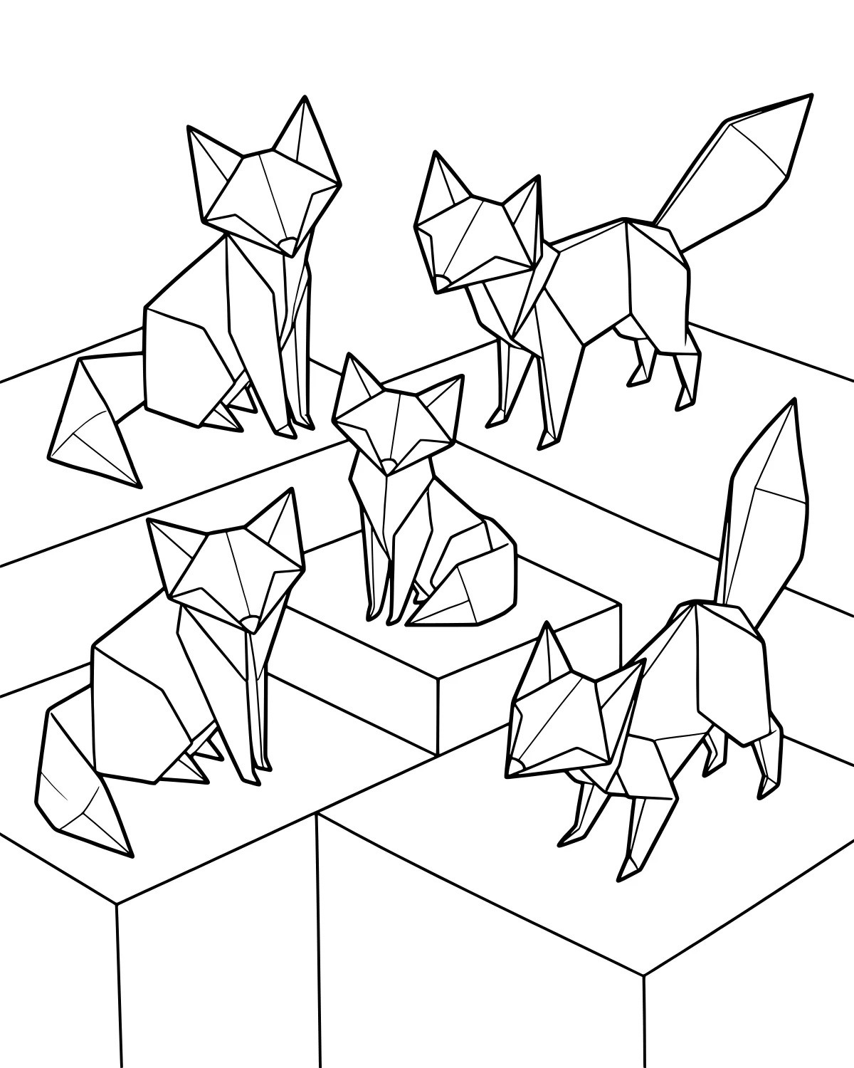 As you look at the page, you will find five different origami foxes scattered across the scene. Each fox is composed of triangles and sharp angles, mimicking the look of real folded paper. They are positioned on a series of geometric blocks of different heights and sizes, which act like small pedestals. Some foxes are sitting tall and alert, while others seem to be looking around their abstract environment. The background is simple and clean, allowing the focus to remain on the crisp lines of the foxes and the blocks they inhabit. Notice how the central fox stands out as a focal point, drawing your eye to the heart of the paper-folded group and the way the shapes overlap.