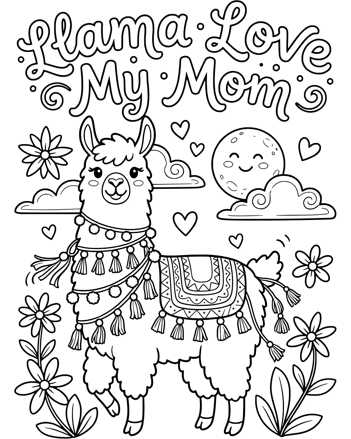Celebrate the special bond between children and their mothers with this adorable llama. This scene captures a fluffy friend surrounded by symbols of affection, making it a perfect gift or a relaxing afternoon project. The text 'Llama Love My Mom' sits at the top, surrounded by a smiling moon and drifting clouds. It is a sweet way to express feelings through art and color while enjoying a peaceful moment of creativity.