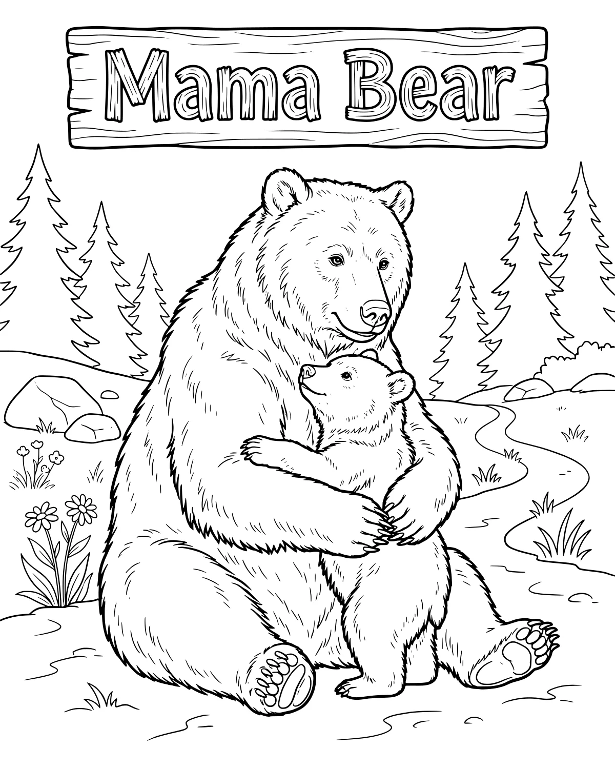 In the center of the illustration, the large mama bear sits protectively next to her smaller cub. They are positioned in a lush clearing filled with tufts of grass and small wildflowers. To the side, a sturdy wooden sign stands near a cluster of smooth rocks, perhaps marking a trail through the wilderness.
