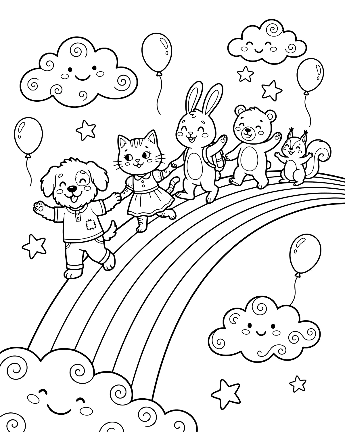 In the center of the page, five happy characters are walking together. You can see the fuzzy bear leading the way next to a tiny squirrel. In the middle, the dog and cat are walking side by side, showing that even natural rivals can be best friends. A long-eared rabbit joins the group as they travel along the arched stripes of a large rainbow. Looking up, the sky is filled with fluffy clouds that look soft enough to touch. Floating around the animals are colorful balloons and sparkling stars, creating a festive atmosphere. Every animal has a unique shape and expression, giving you plenty of details to focus on while you work across the scene.