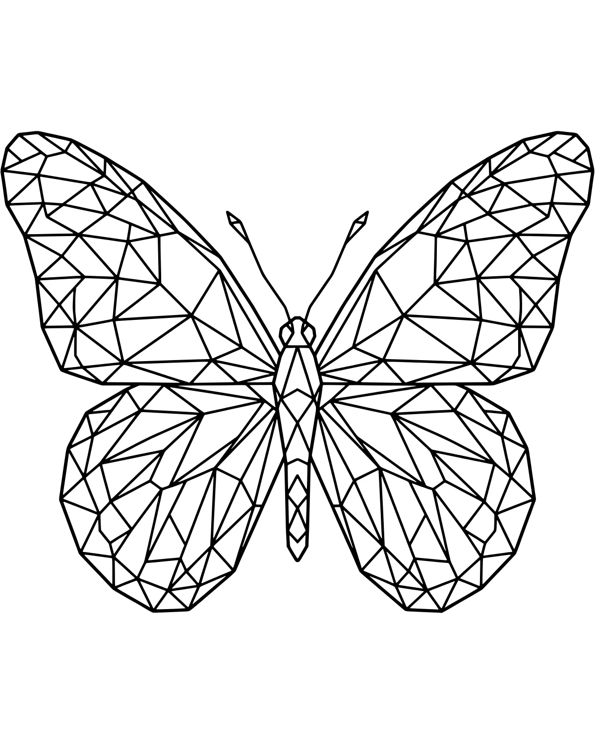 At the center of the page, you will find a large butterfly with its wings spread wide in a symmetrical pose. Each wing is carefully divided into a network of triangles and polygons, which creates a crystalline or faceted effect across the entire surface. The body of the butterfly is also composed of smaller geometric segments, leading up to two delicate antennae at the very top.