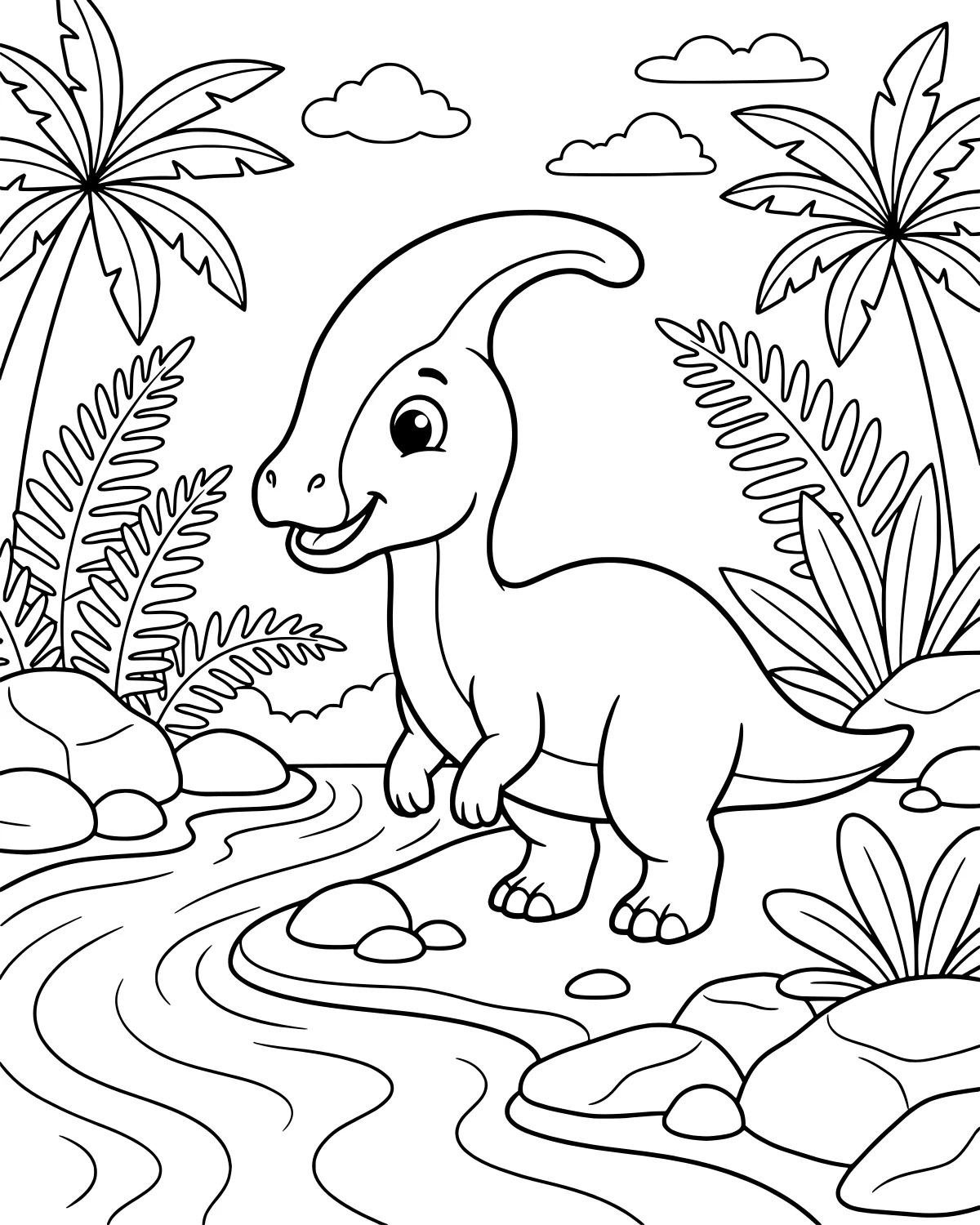 In the background, tall palm trees with large fronds reach toward the sky. Fluffy clouds drift above the ancient forest, giving the entire scene a sense of depth and openness. Every element, from the dinosaur's friendly expression to the rippling water, is designed with clear outlines that make it easy to choose different colors for each part of the prehistoric scenery.