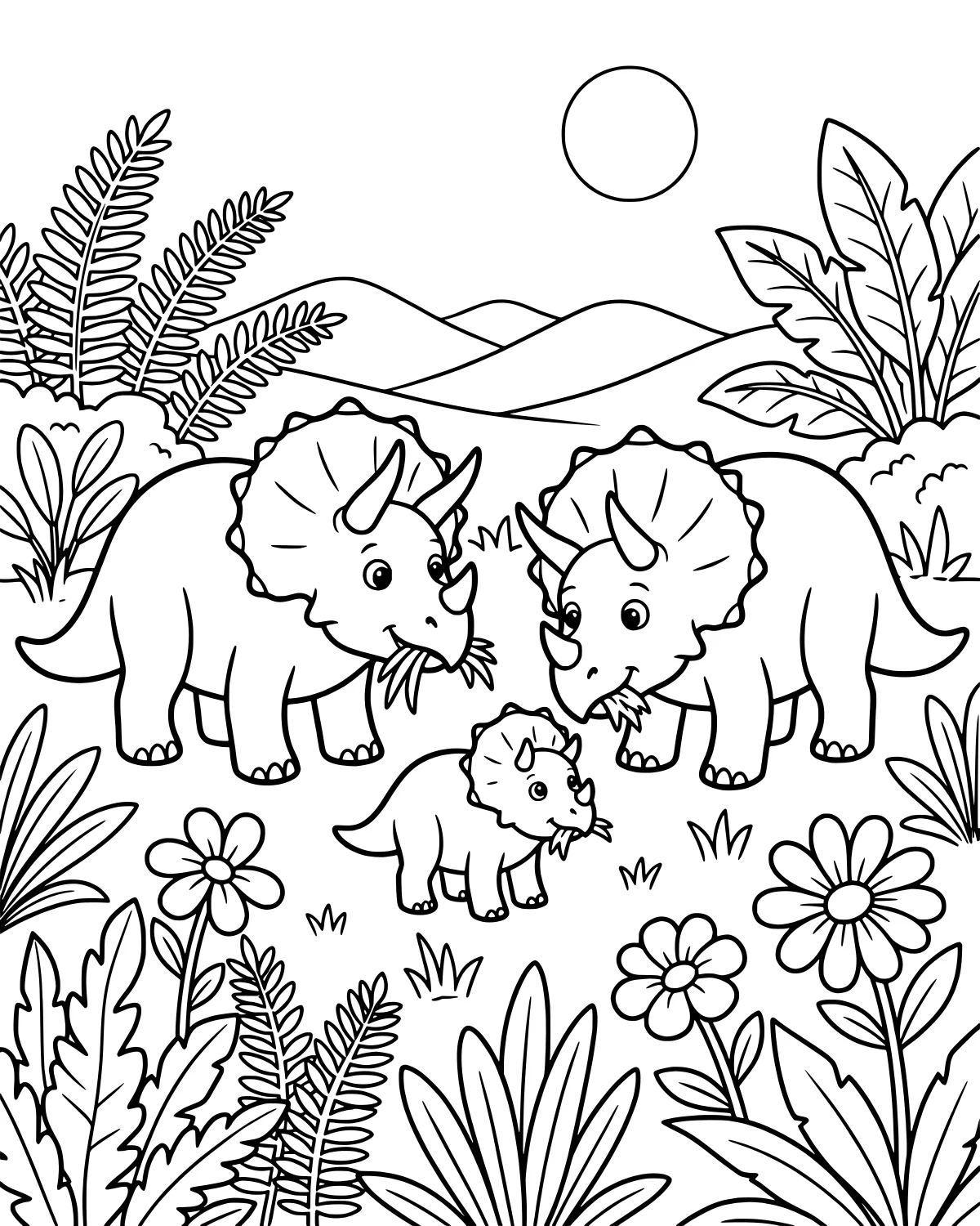 As you look at the page, you will see the iconic three horns and large neck frills that make these creatures so recognizable. The surrounding scenery is filled with ancient plants and rolling hills, creating a complete world for you to bring to life. This page is perfect for anyone who loves these gentle giants and wants to spend time adding color to a friendly, prehistoric landscape.