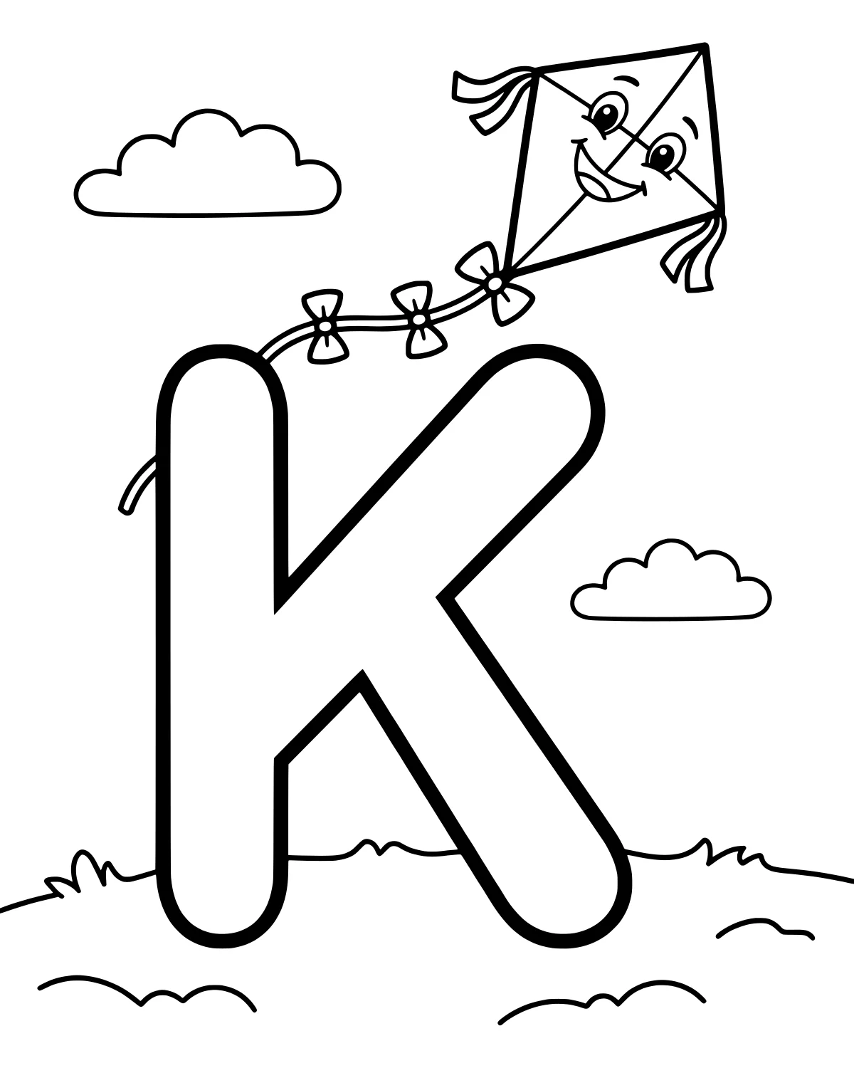 At the center of the page, you will find a large, thick letter K that is easy to fill with bright colors. Attached to the top of the letter is a long kite string that reaches up toward the sky. Along the string, there are several small bows that add a touch of charm to the scene. The kite itself has a happy face, making it look like a friendly character watching over the landscape.