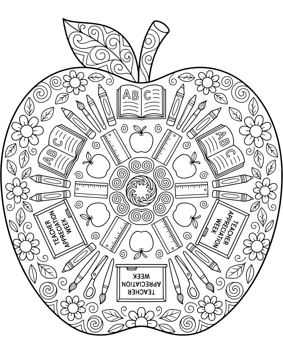 The top of the apple features a sturdy stem and a delicate apple leaf. Near the bottom, two chalkboards proudly display the words Teacher Appreciation Week, framed by even more small apples and lush leaves. Every corner of the apple is filled with decorative elements, ensuring that every stroke of your pencil adds to a rich, textured scene of academic celebration.