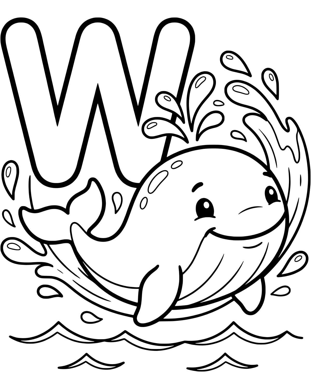This cheerful scene features a friendly whale leaping high out of the sparkling ocean. Behind our aquatic friend stands a large, bold letter W, making it a perfect way to practice the alphabet. The whale has a big smile and bright eyes, clearly enjoying its time in the sun. Children will love the playful energy as the whale creates big splashes in the water. It is a wonderful way to connect animals with letters. This page offers plenty of space for bright colors and creative shading.