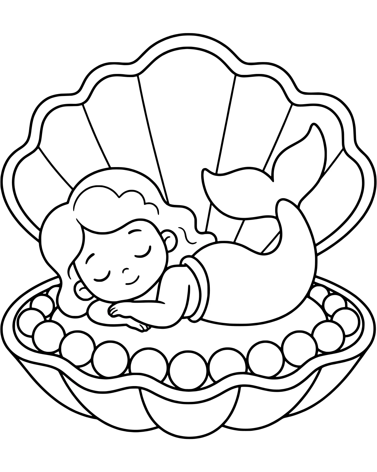 In the center of the page, the little mermaid is curled up with her eyes closed and a tiny smile on her face. Her long, flowing hair and decorative tail are ready for some bright colors. She is lying inside a large, open clam shell that has beautiful ridges along the outside. Scattered all around the bottom of the shell are many round, shiny pearls of different sizes. The moderate line density makes it easy to stay within the lines while still providing enough detail to make the scene look rich and full of life. The cartoon style gives every element a soft and friendly appearance.