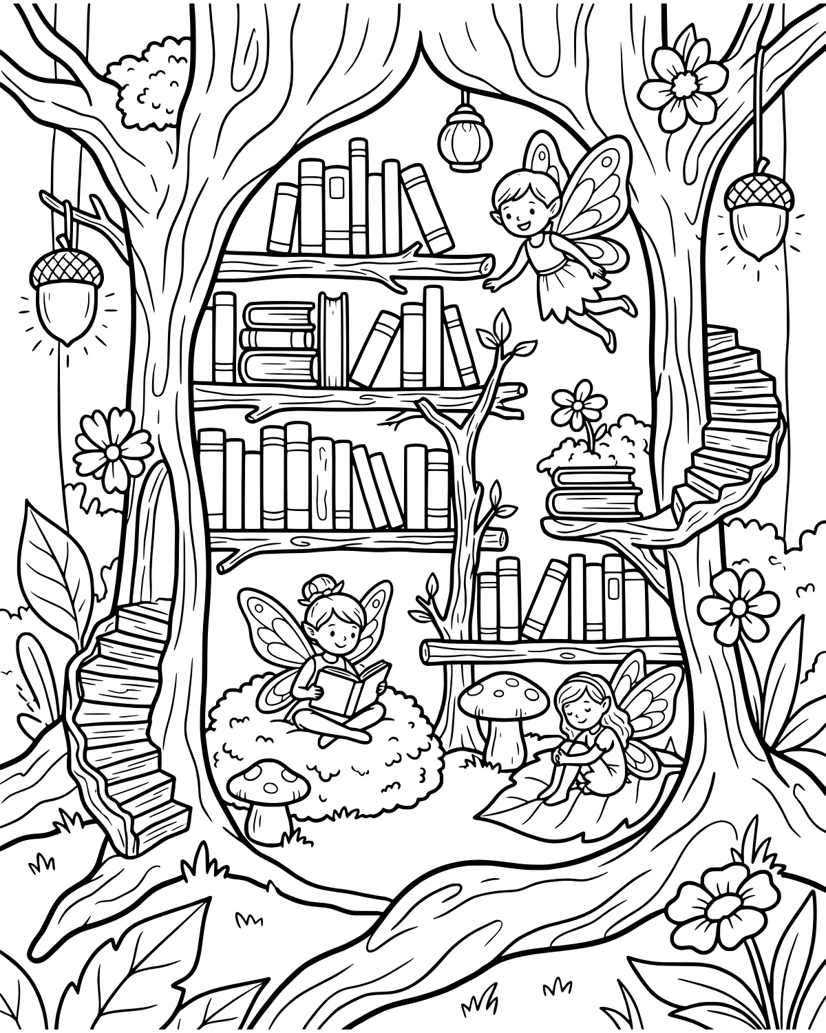 It is a perfect spot for anyone who loves both nature and reading. You can spend time coloring the delicate wings of the fairies as they browse the many shelves. This whimsical world brings together the beauty of the forest with the wonder of a great book.
