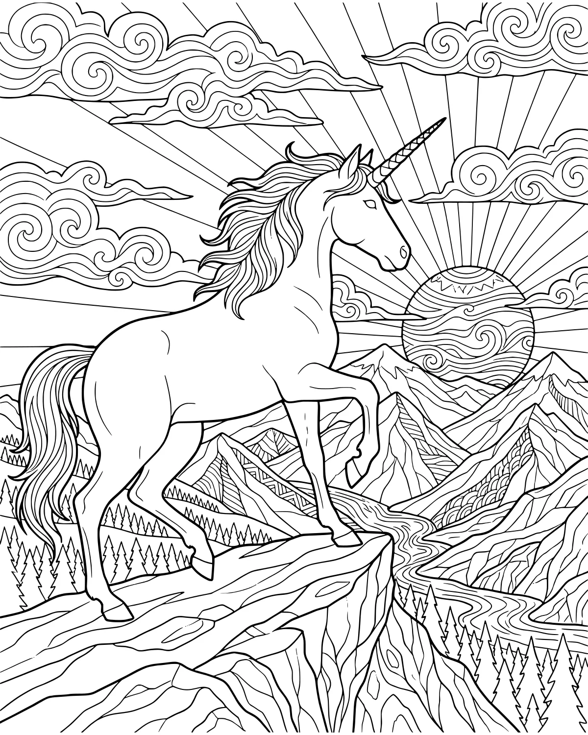 This majestic unicorn stands proudly on a rocky cliff, gazing out over a vast and beautiful world. Below its hooves, a winding river snakes through a valley filled with tall trees and rolling mountains. High above, a bright sun peeks out from behind soft clouds, casting a warm glow over the entire landscape. It is a scene of peace and wonder that invites anyone to add their own splash of color to this mythical adventure. This page offers a perfect balance of nature and fantasy for young artists.
