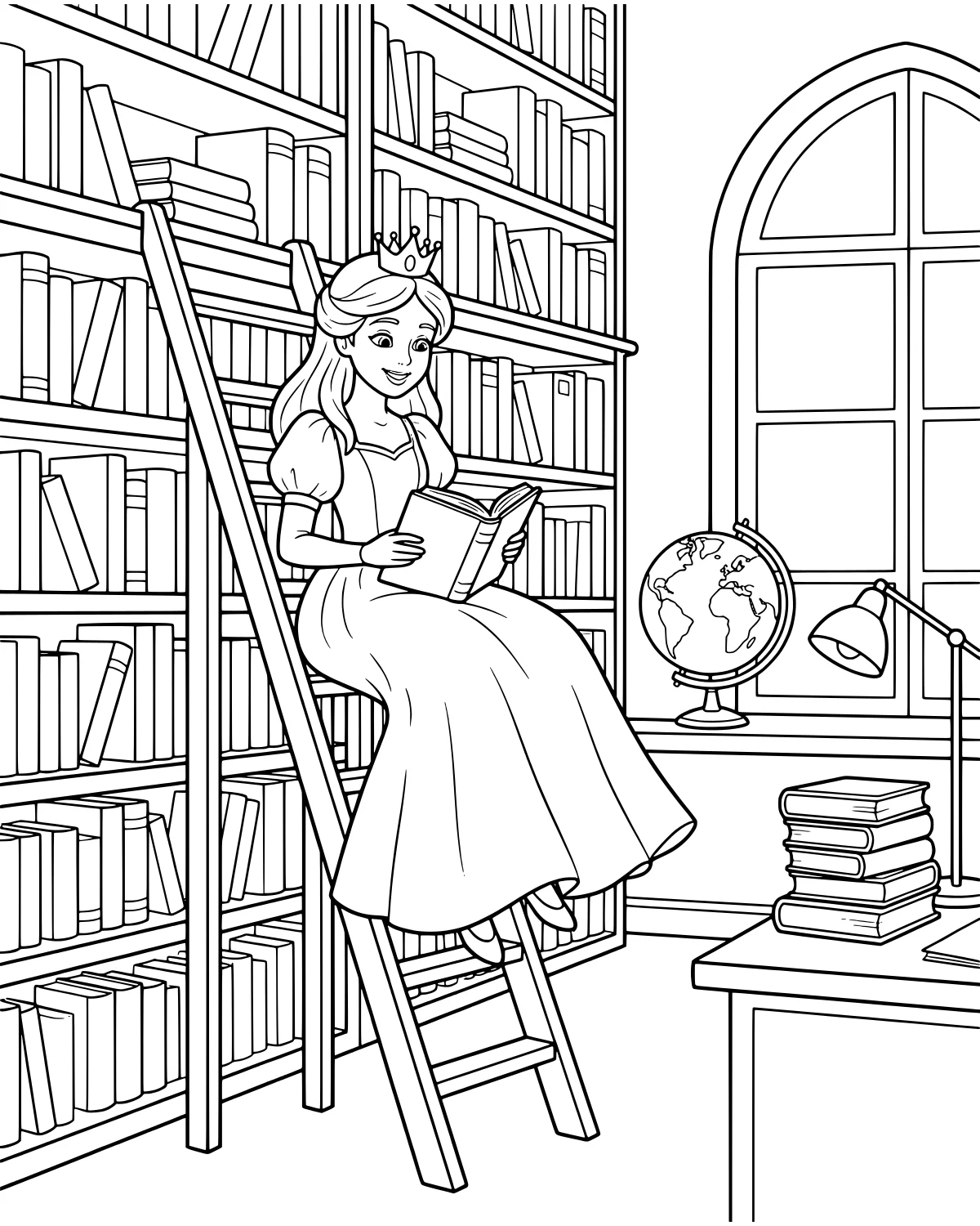 To her side, a sturdy desk holds a detailed globe, an elegant lamp, and a neat stack of books waiting to be read. A large arched window in the background lets in light from the palace gardens, showing just a glimpse of the kingdom outside. You will also find small details like the texture of the wooden ladder and the individual spines of the many books that make this a wonderful scene to fill with color.