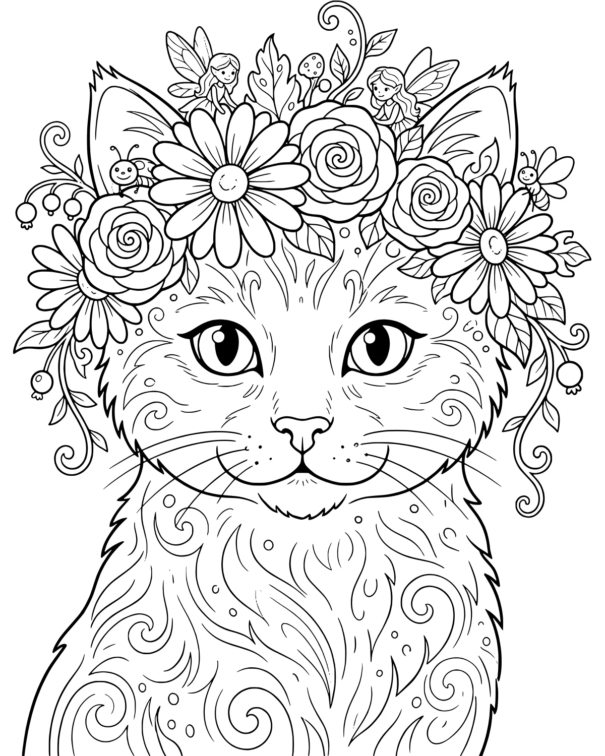This enchanting scene features a playful cat wearing a magnificent crown made of garden treasures. It is not just any ordinary hat; this flower crown is bursting with life, featuring delicate daisies, lush roses, and even tiny fairies fluttering among the petals. The cat’s large, expressive eyes invite you to spend a quiet afternoon adding color to its magical world.
