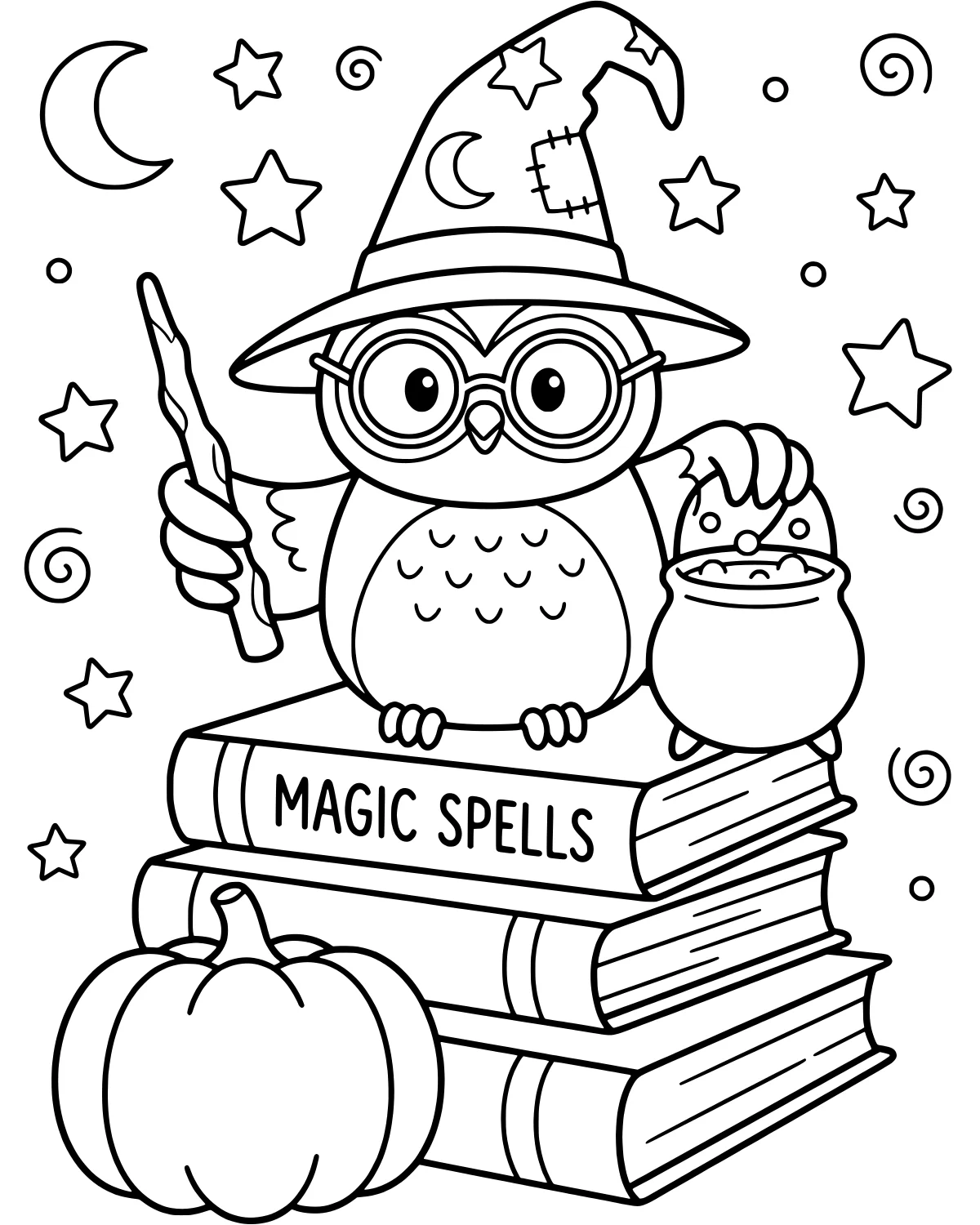 In the center of the page, a scholarly owl sits proudly on three thick books. The owl wears a classic pointed witch hat decorated with a band and a pair of round glasses that highlight its large, curious eyes. In its wings, it holds a slender magic wand and a small cauldron that is overflowing with circular bubbles. At the base of the book stack, a round pumpkin with a sturdy stem adds a touch of harvest charm to the composition.