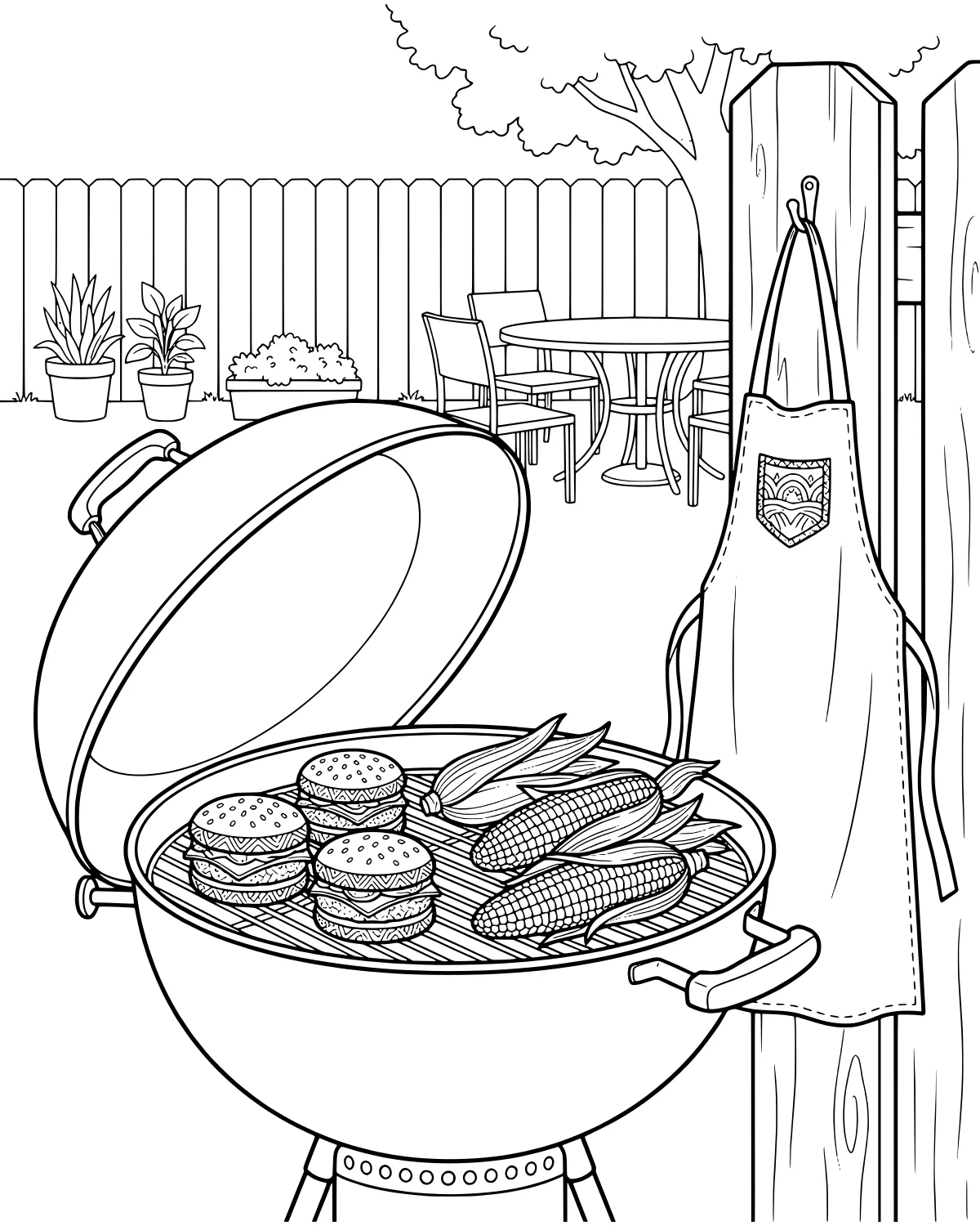 You will find a classic charcoal grill with its lid open, showing off several round burgers and ears of corn on the cob resting on the grate. A chef's apron hangs neatly from a hook on the wooden fence, waiting for the cook to return and finish the meal. The fence provides a beautiful backdrop for the entire scene, stretching across the yard.