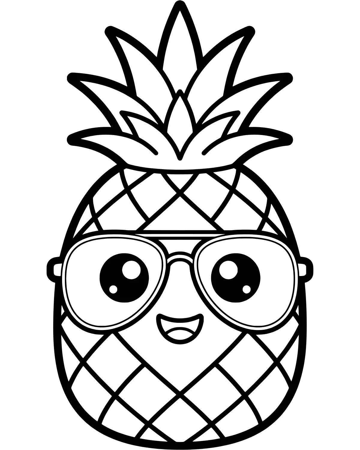 In the center of the page, you will find a large pineapple with a very expressive face. It wears a pair of thick-rimmed sunglasses that cover its eyes, giving it a very cool and relaxed look. Below the shades, a simple, curved mouth shows off a happy expression.