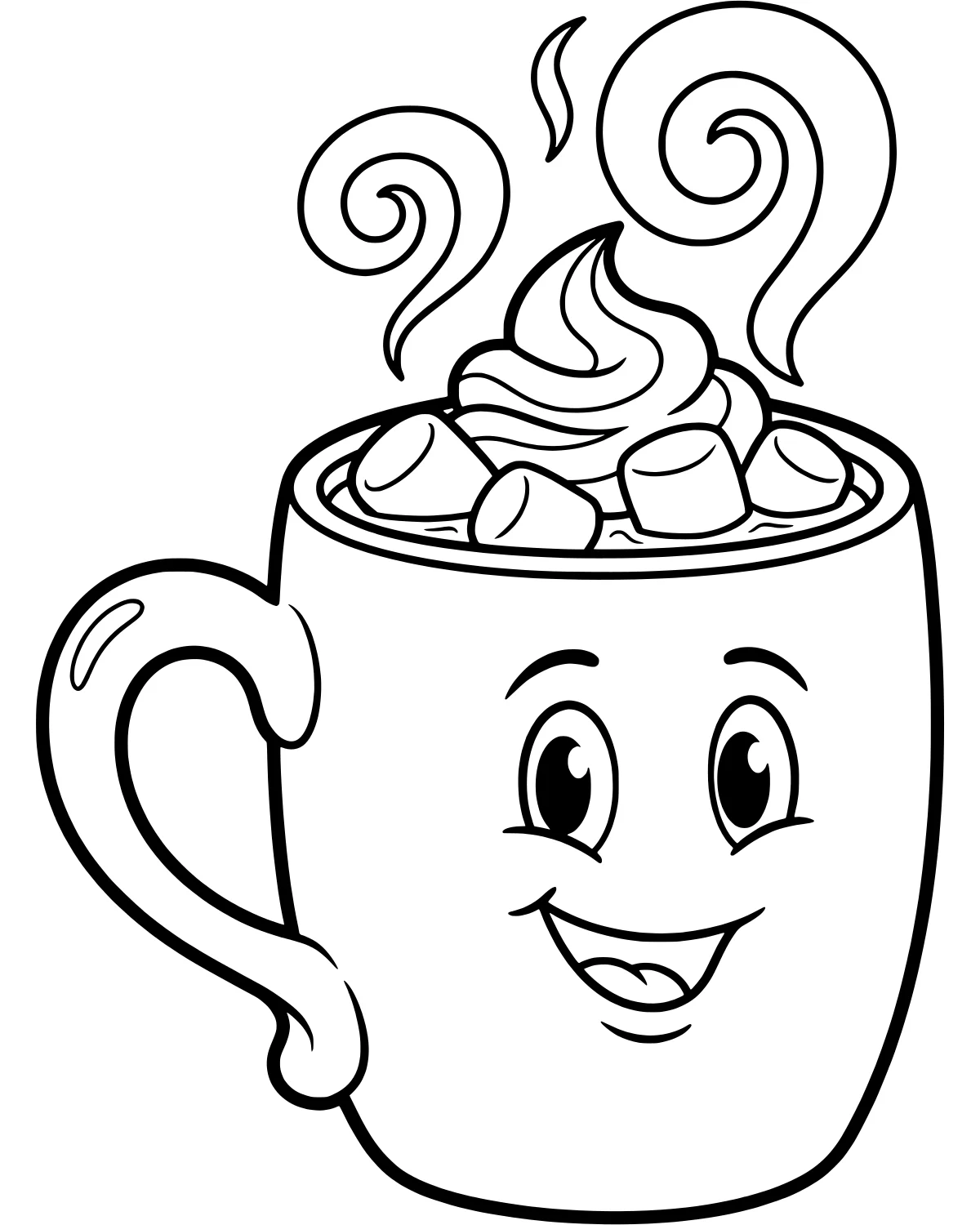 It is topped with a mountain of whipped cream and several fluffy marshmallows, making it look like the ultimate winter treat. This friendly character is sure to make you smile while you choose your favorite shades to fill in the scene.