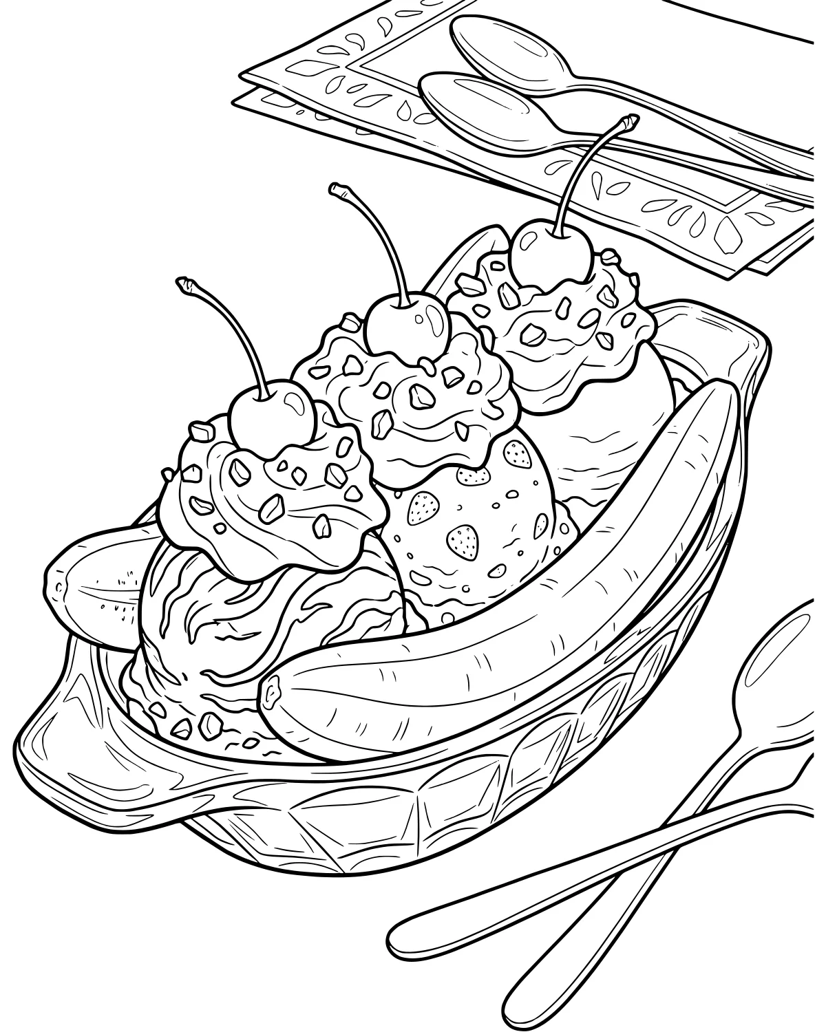 This classic banana split is ready for some vibrant colors. Imagine sitting at an old-fashioned diner and ordering the biggest dessert on the menu. This scene captures the joy of a three-scoop sundae nestled between two banana halves, topped with clouds of whipped cream and bright cherries. It is a perfect choice for anyone who loves sweet treats and wants to practice coloring different textures like smooth ice cream and fluffy cream.