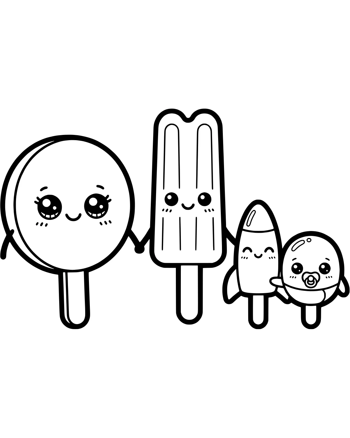 As you look at this page, you will see four distinct popsicle characters standing side-by-side. On one side, there is a tall rocket popsicle with its classic pointed top and segmented sections. Next to it stands a classic round popsicle with a big, friendly smile. In the middle of the group is a wide double popsicle, which looks like two treats joined together on two separate sticks. Finally, at the end of the line is the smallest member of the group, a cute baby popsicle that is even wearing a tiny pacifier.