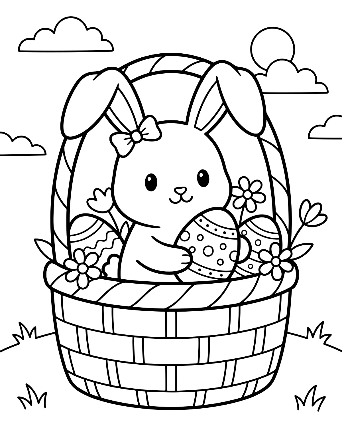 In the background, a warm sun shines down from a sky filled with fluffy clouds. The bottom of the page shows a line of grass where the basket sits, providing a grounded feel to this outdoor spring scene. Every element, from the petals on the flowers to the textures on the basket, provides a clear area to fill with color. The balance of simple shapes and detailed patterns makes this a satisfying page to complete.