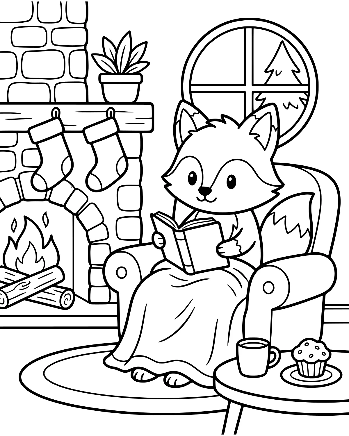 You will find a clever fox sitting comfortably with a thick blanket draped over its lap. On a small table nearby, there is a steaming mug and a delicious muffin waiting to be enjoyed. The fireplace is filled with burning logs, and a beautiful potted plant sits on the mantelpiece alongside three hanging stockings. Through the window, you can spot a decorated Christmas tree standing tall in the yard. A soft, round rug sits beneath the chair, making the whole room feel extra inviting for a quiet afternoon of reading. Every detail from the wood grain on the table to the pages of the book is ready for your favorite colors.