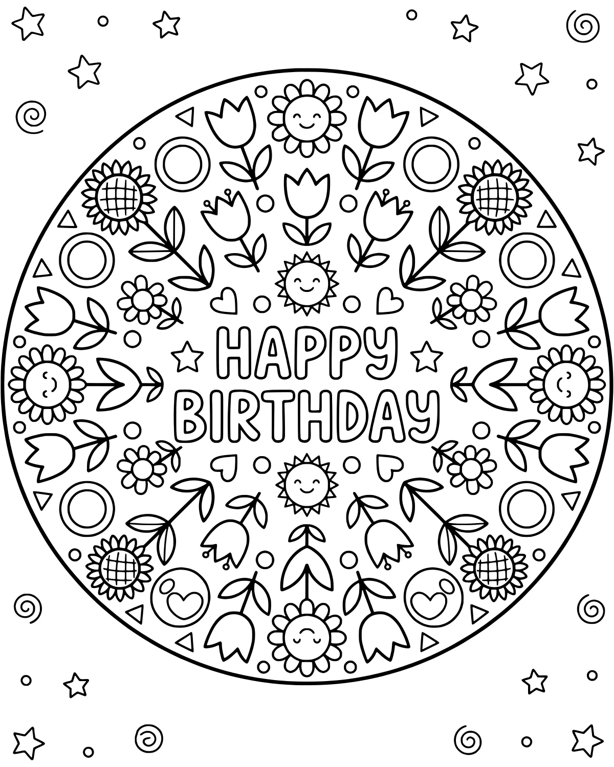 As you look at this coloring page, you will find the words Happy Birthday right in the middle, waiting for bright colors. Circling the text are happy, smiling suns that look like they are beaming with excitement. You will also see beautiful sunflowers and tulips reaching out toward the edges of the circle.