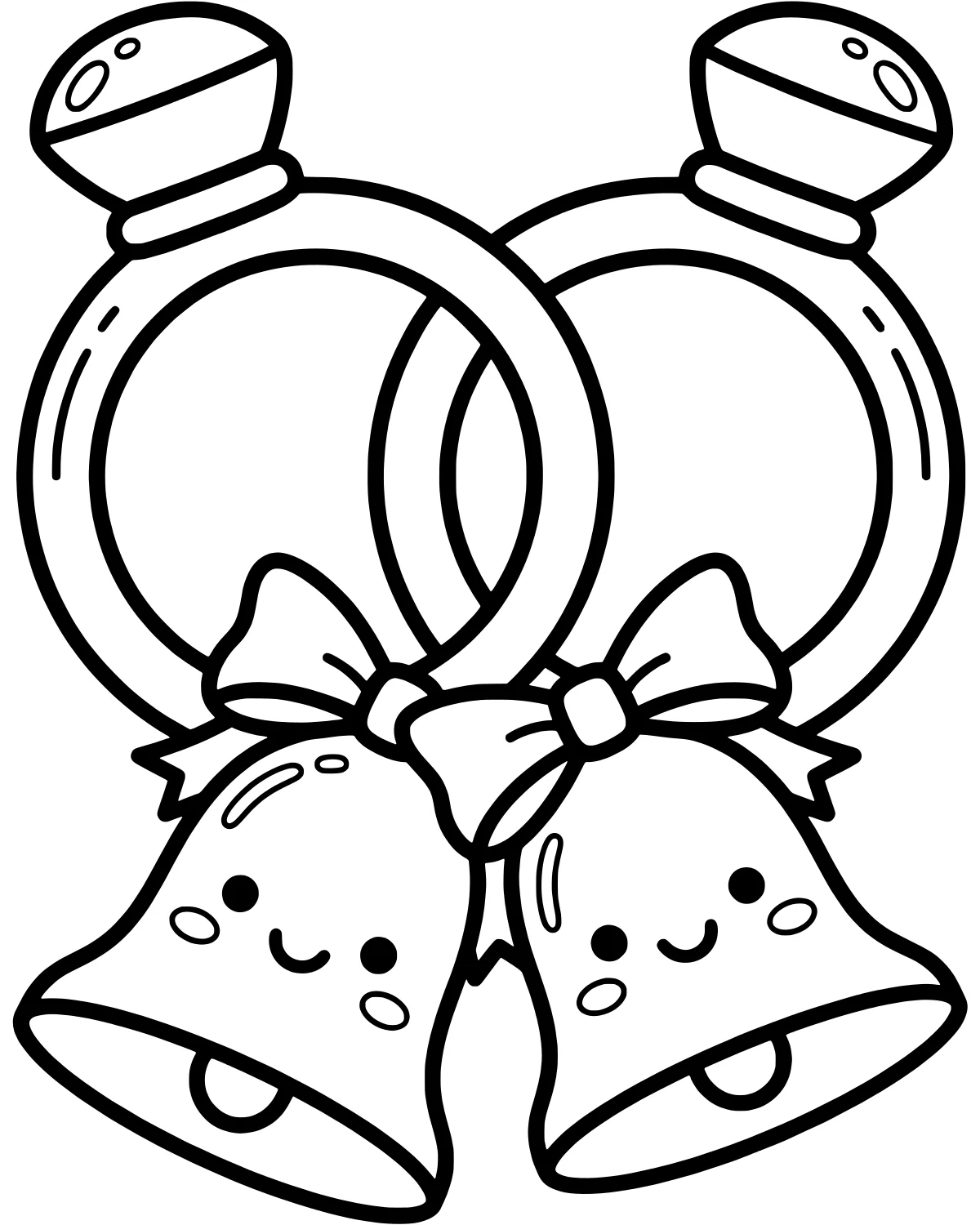 The bows offer a great chance to use your favorite bright colors, such as romantic reds, soft pinks, or even a cheerful sky blue. Since this page has a moderate line density, colored pencils or crayons work beautifully. If you want to make the bells' faces pop, try using a slightly darker shade for their features to make those smiles stand out. Adding a light glow around the rings with a yellow marker can create a magical effect.