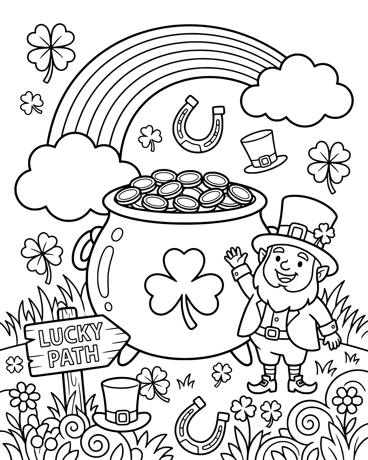 Scattered throughout the scene are iconic symbols like three-leaf shamrocks, lucky horseshoes, and extra top hats resting on the ground. Whimsical swirls dance in the air, adding a touch of magic to the grassy terrain. Every corner of the page offers something new to color, from the tiny petals of the flowers to the individual coins spilling out of the pot.