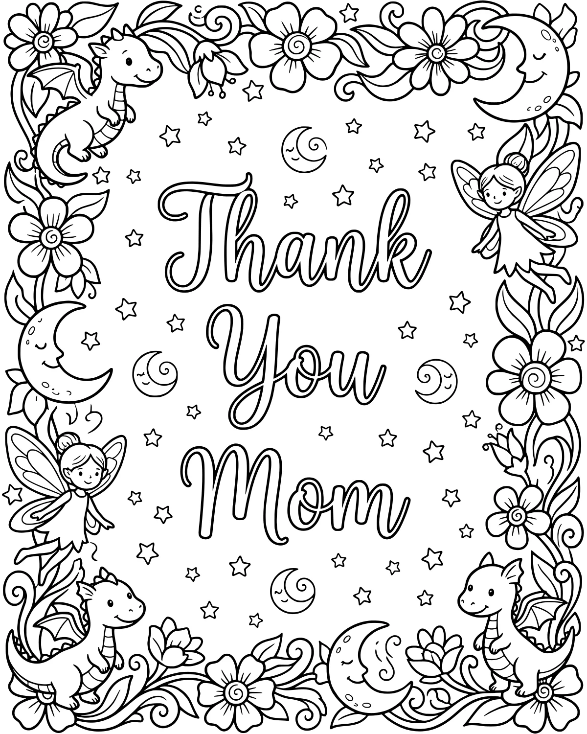 This charming scene is a wonderful way to show appreciation with a touch of magic. The central message Thank You Mom is surrounded by a lively border filled with mythical friends and nature. You will find friendly dragons and graceful fairies peeking out from behind blooming flowers and delicate leaves.