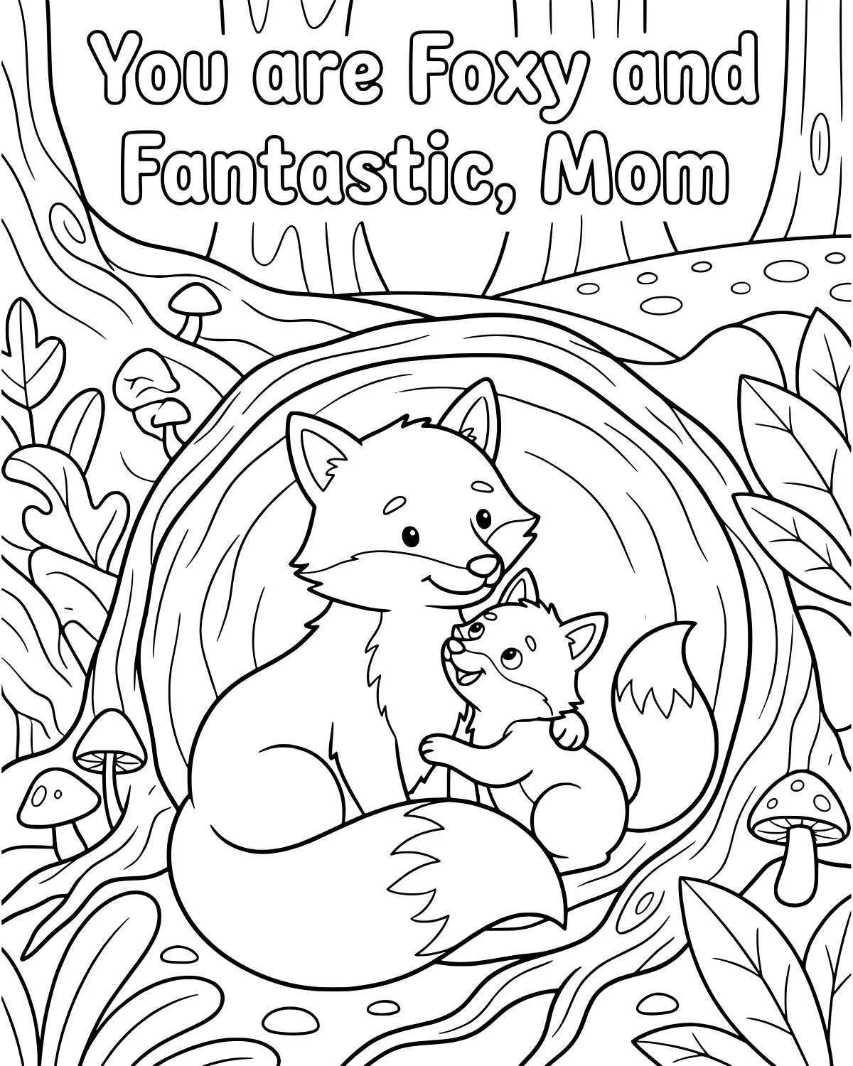 This sweet scene captures a tender moment between a mother fox and her little cub. They are tucked away safely inside a cozy hollow tree trunk, showing the special bond that forest families share. It is a wonderful way to celebrate a parent or guardian who makes life feel magical and safe. The affectionate embrace between the two animals creates a sense of peace and love that is perfect for a quiet afternoon of art. This page is particularly special because it includes a cheerful message that honors the important role a mother plays in our lives.