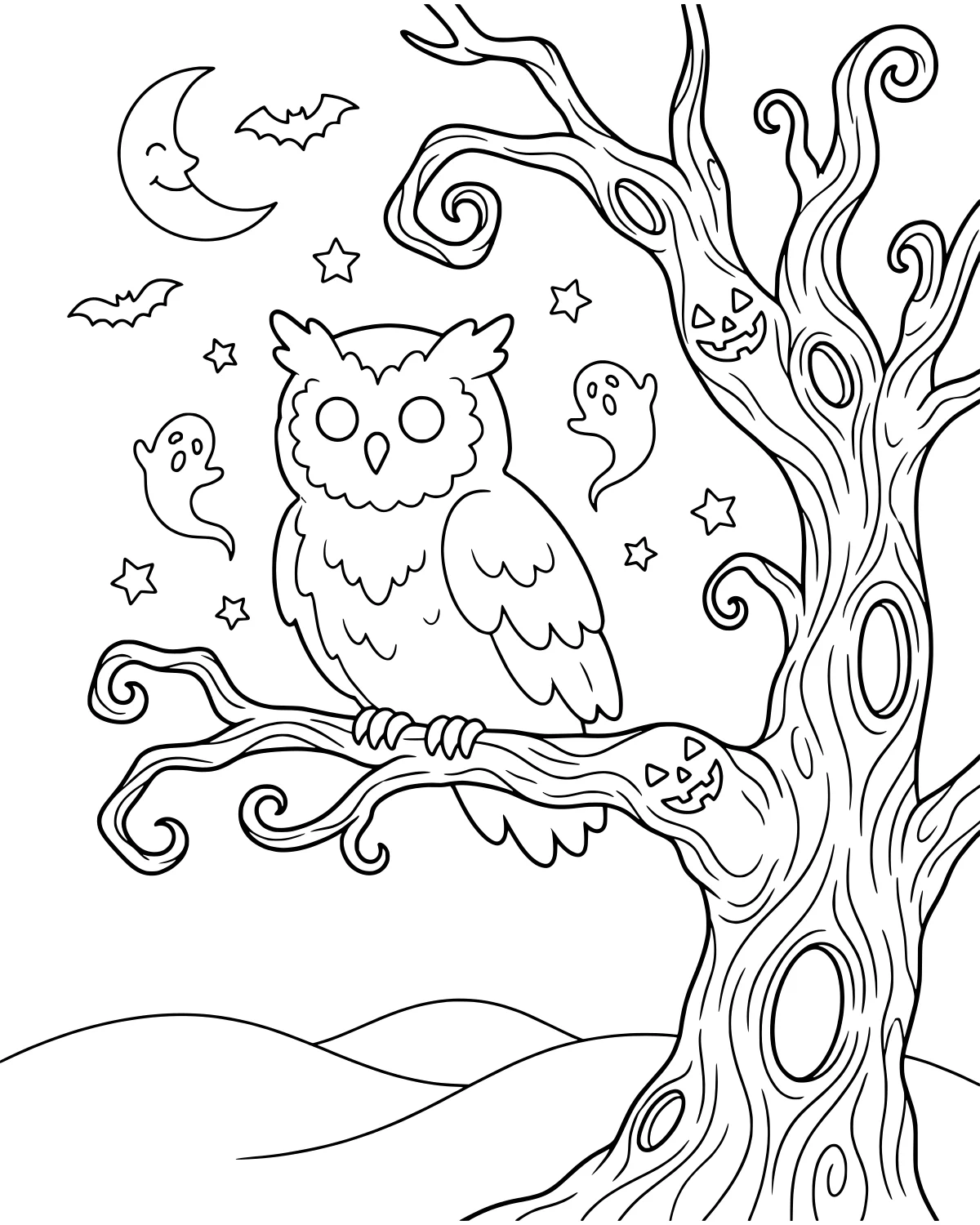As you look at the page, your eyes might first land on the large owl perched high on a sturdy branch. The gnarled tree is unique because it features several jack-o'-lantern faces carved right into its trunk and hollows, giving the wood a personality of its own. In the sky, a large moon with a friendly face beams down on bats fluttering through the air and twinkling stars. Tiny ghosts float around the branches, looking more playful than frightening. Below the tree, rolling hills provide a soft foundation for this midnight adventure, creating layers of depth for you to color.