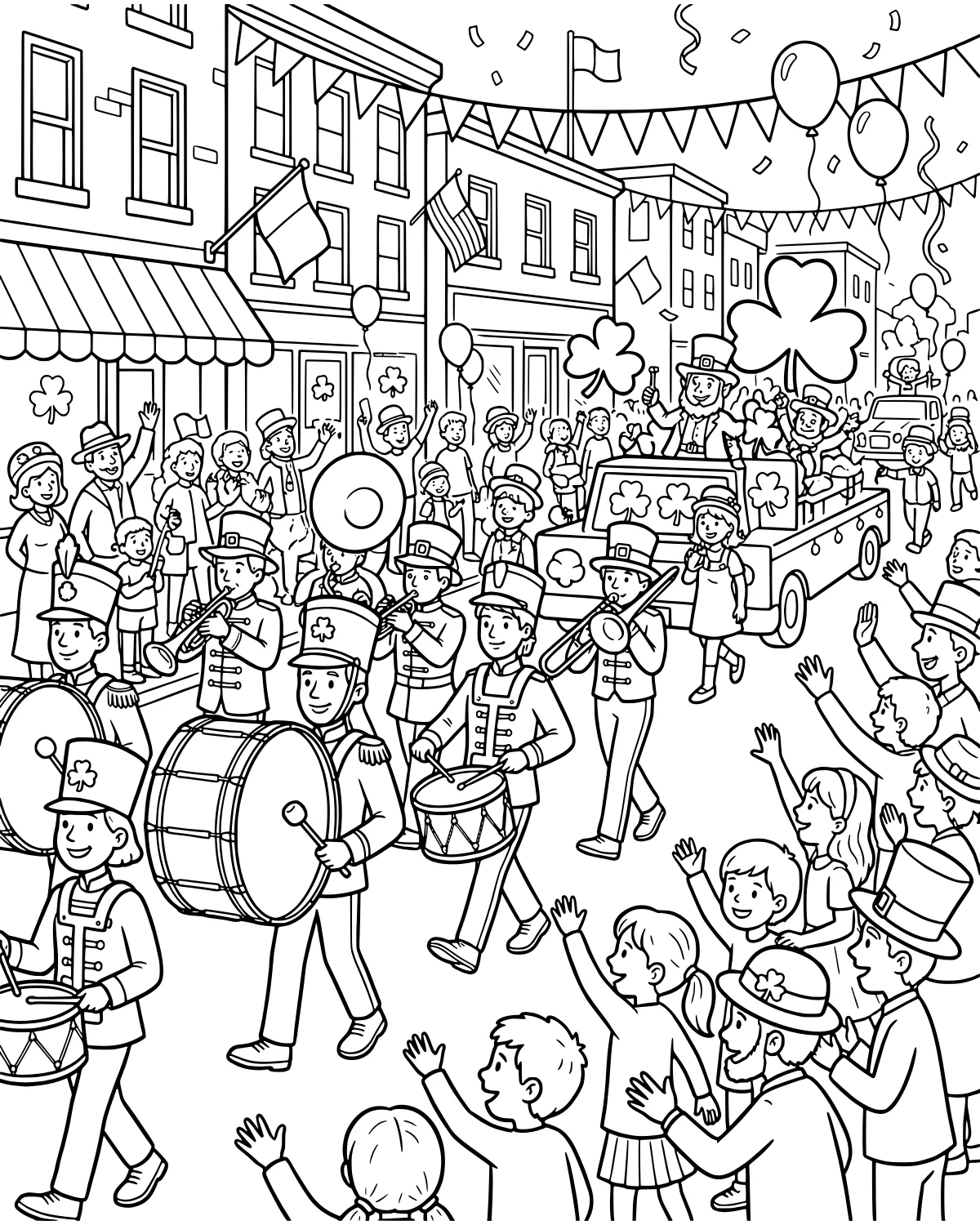 After you finish coloring, try to count all the shamrocks hidden throughout the parade. You can also look for different musical instruments and see if you can identify each one by name. For extra fun, try drawing your own festive banner in one of the blank spaces on the buildings or add more confetti to the sky.