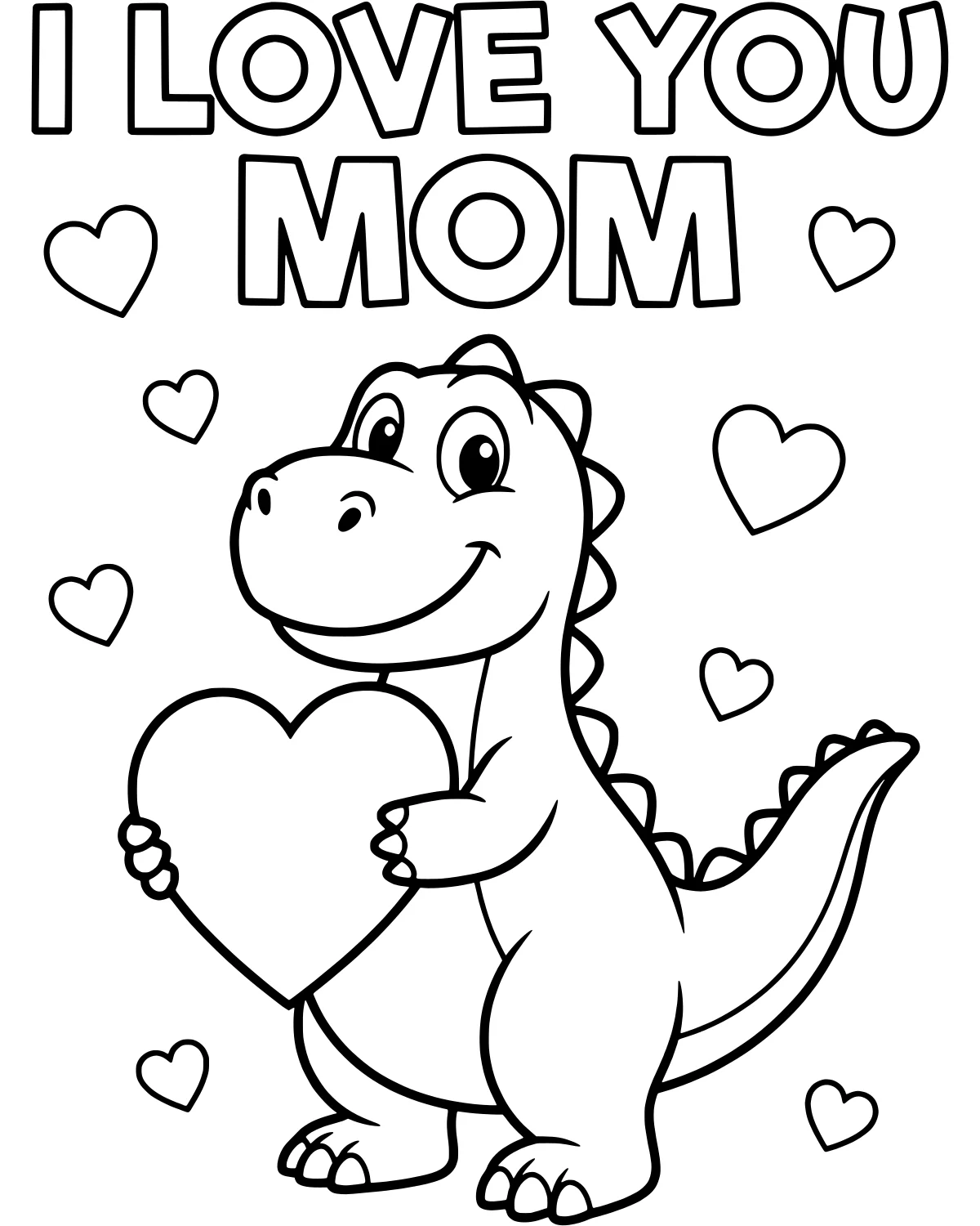 This charming scene features a sweet cartoon dinosaur expressing a big message of love. Holding a large, smooth heart in its claws, this friendly prehistoric pal is surrounded by smaller floating hearts that add a sense of joy and warmth. The bold text at the top clearly states I Love You Mom, making this a wonderful way for children to show their appreciation through art.