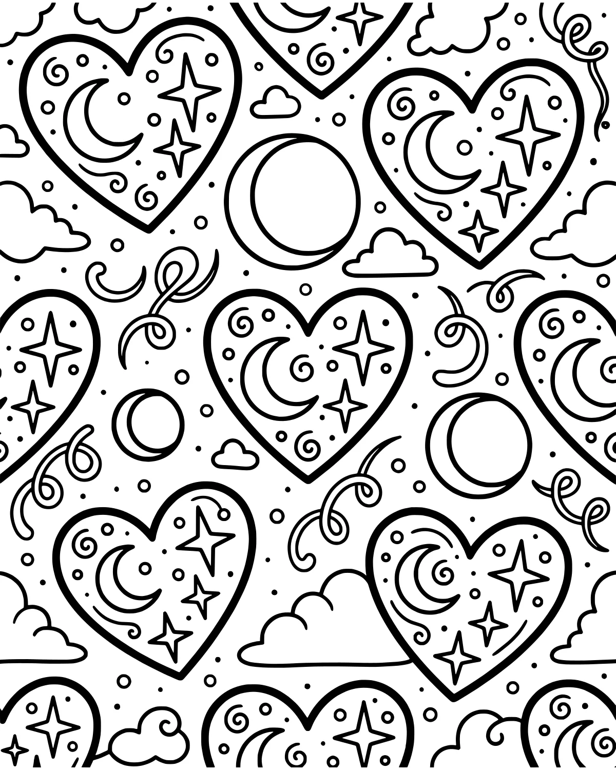 Throughout the sky, delicate swirls and tiny dots add a sense of movement, as if a gentle breeze is blowing through the cosmos. Every corner of the page offers something new to discover, from the patterns inside the hearts to the way the celestial bodies are arranged. It creates a balanced and harmonious scene that feels both organized and magical.