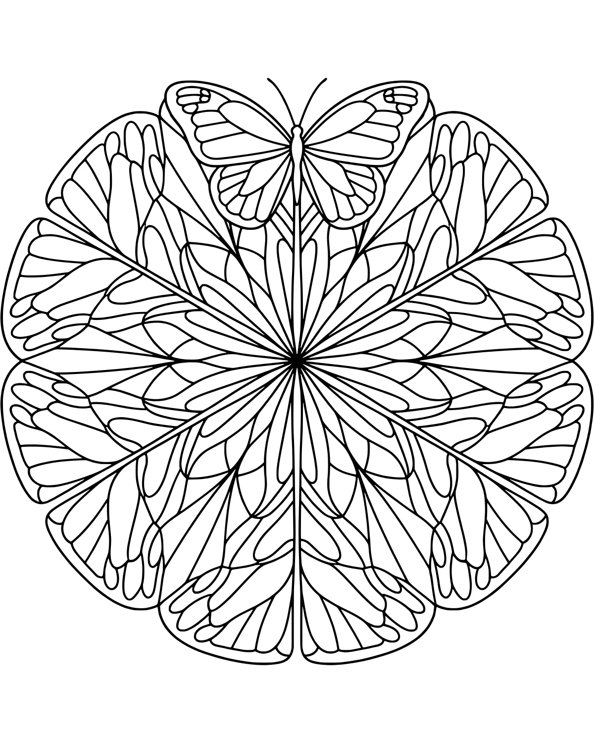 At the center of the page, you will find a large butterfly with its wings spread wide to show off elaborate markings. It sits directly on a circular mandala made of repeating petal-like shapes that radiate outward from the middle. Around the edges, you can spot various geometric patterns like circles and triangles that frame the insect. Every layer of the mandala adds more detail, from the tiny dots in the center to the larger sweeping curves on the outer rings.