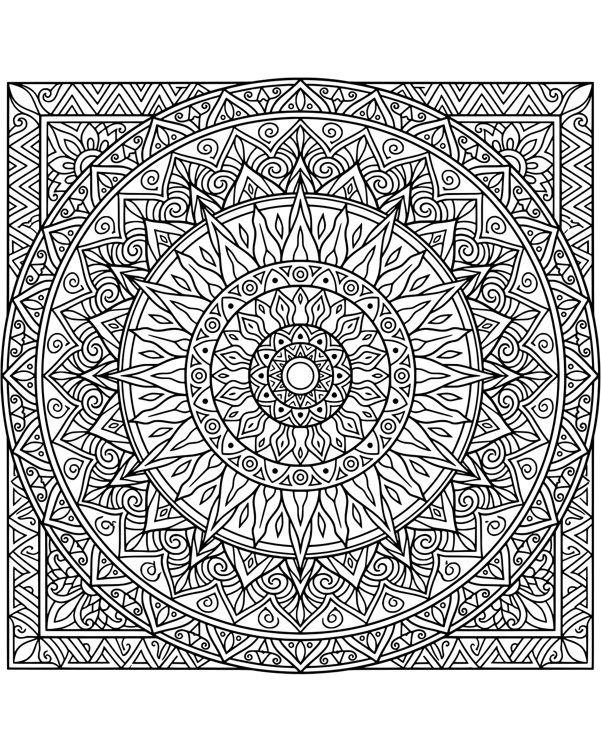 As you explore this page, you will find an inner sun-like pattern that anchors the entire composition with its sharp, radiating lines. Moving away from the center, you encounter soft petal-like shapes that contrast beautifully with the sharper triangular motifs found further out in the rings. The design also features graceful swirl patterns tucked between the geometric layers, adding a sense of movement to the otherwise structured concentric rings. Everything is held together by a sturdy and detailed geometric border, all contained within a perfectly balanced square frame. Each layer of the mandala offers a new set of shapes to discover, from the tiny dots to the larger sweeping curves that define the outer edges of the artwork.