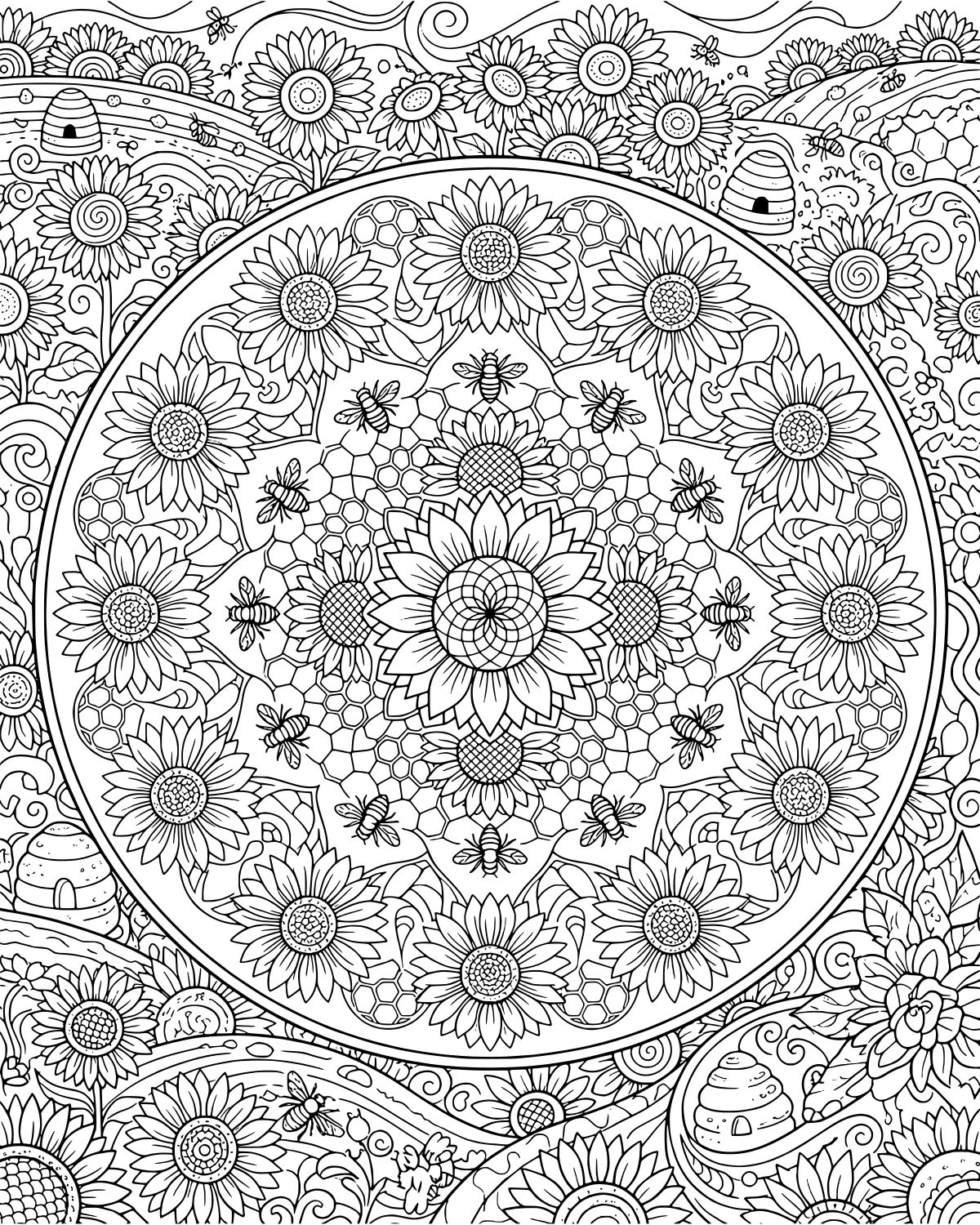In the center of the page, a large sunflower serves as the heart of the mandala, surrounded by perfectly shaped honeycomb cells. Busy bees are scattered throughout the design, some landing on the petals while others hover near the swirls and delicate leaves. The symmetry of the flowers and patterns creates a sense of calm and order.