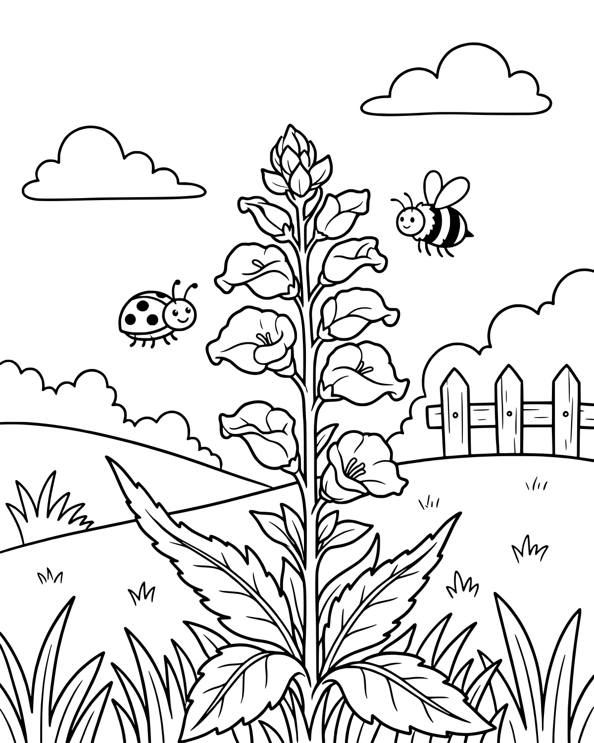 After you finish coloring, you might enjoy going for a walk to see if you can spot any tall flowers or busy insects in your own neighborhood. You could also try drawing your own tiny fairy or garden gnome hiding behind the large leaves at the bottom of the plant to expand the story of this garden scene.