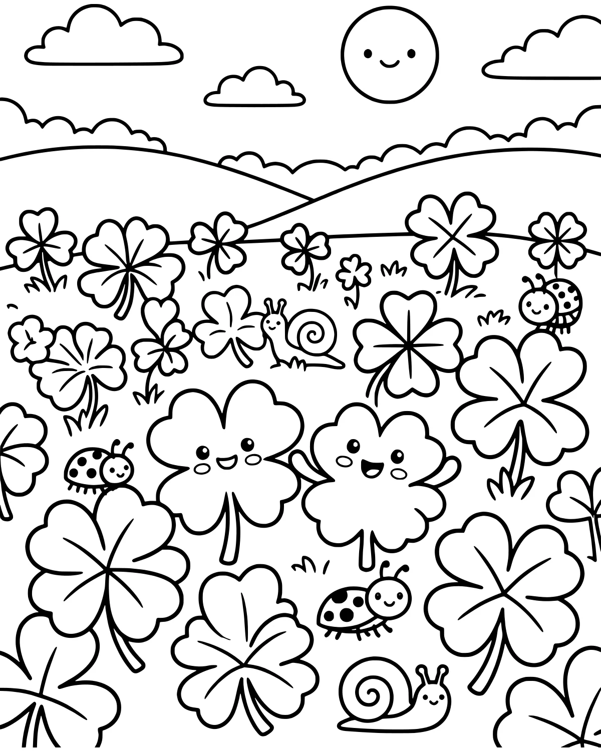 In the background, smooth, rolling hills provide a sense of depth to the scene. The sky is dominated by a giant, smiling sun with bold rays reaching out toward the edges of the page. Two soft, cartoon-style clouds float nearby, completing this peaceful outdoor setting. Every element is designed with clear, bold outlines that make it easy to identify the different insects and plants making up this lucky garden.