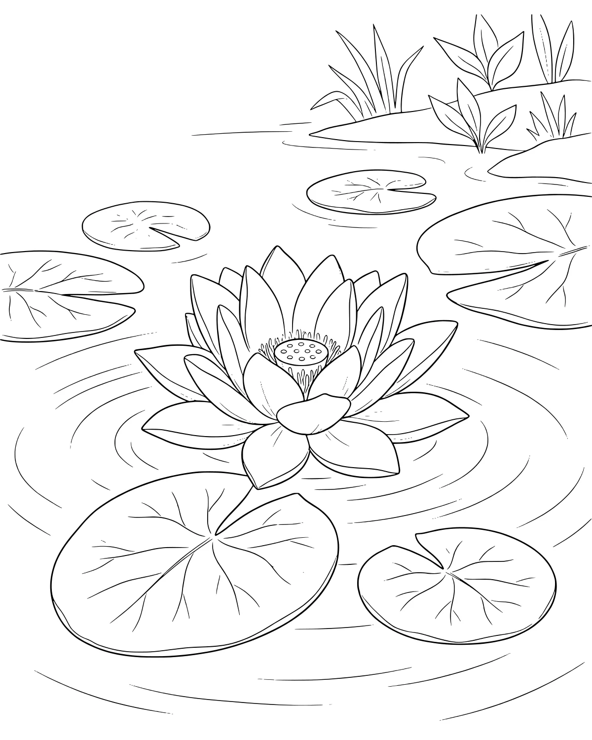 After you finish coloring the scene, you could draw a small frog resting on one of the lily pads or a dragonfly hovering near the reeds. You might also try to write a short poem about what it would feel like to sit by this quiet pond on a warm summer afternoon.