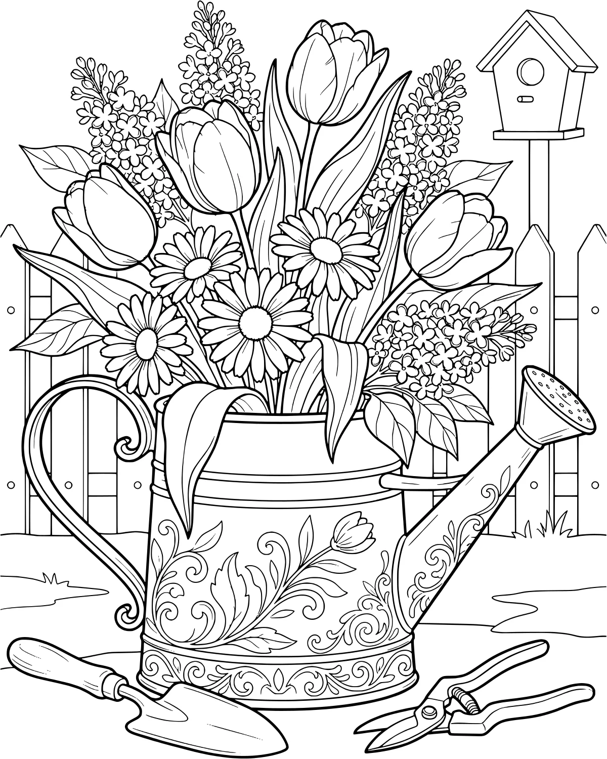 As you look closer at this garden scene, you will find intricate decorative patterns on the side of the watering can that are perfect for adding fine details. Resting in the grass just in front of the can are a trowel and a pair of pruning shears, ready for the next planting task. In the background, a sturdy wooden fence provides a backdrop for a cozy birdhouse perched high up, waiting for a feathered friend to visit. Every element from the individual flower petals to the wood grain on the fence invites you to explore different textures and shades.