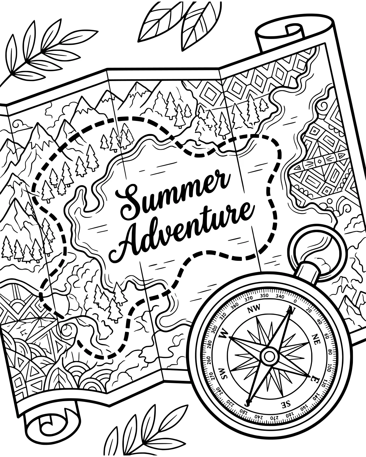 A clear dotted line path marks the route for an exciting journey. In the corner, a detailed compass helps with navigation, surrounded by scattered leaves that add a touch of nature to the scene. You can also find interesting geometric patterns decorating the edges of the paper, framing the entire adventure.