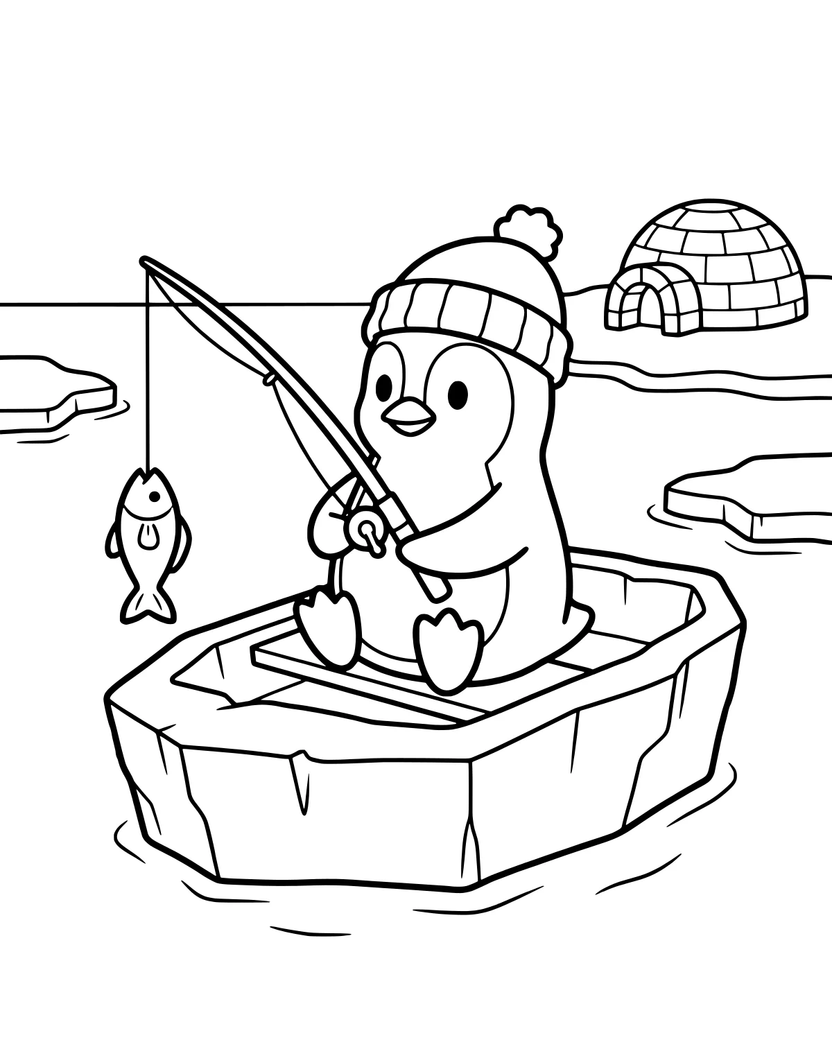 Looking closely at this illustration, you will find the penguin holding a sturdy fishing rod as a small fish splashes out of the water. The penguin is perched inside a simple rowboat that floats near several large icebergs. In the distance, a cozy igloo sits on the frozen shore, suggesting a warm home nearby. The background features gentle ripples in the ocean and clear skies above the icy landscape. Every element from the penguin's pom-pom hat to the texture of the boat is ready for a splash of color. You can see the tiny details on the fish and the rounded blocks used to build the igloo.