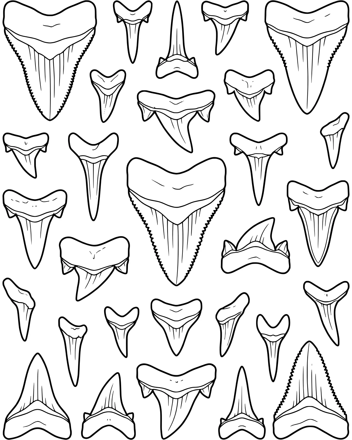 This page brings together a fascinating collection of shark teeth from different species and eras. You can explore the sharp, serrated edges of a Great White shark tooth alongside the massive, ancient remains of a Megalodon tooth. It is a perfect way to learn about the ocean's most powerful predators while enjoying a relaxing coloring session. Each tooth has a unique shape and history, making this an educational adventure for young explorers who love the mysteries of the deep sea.