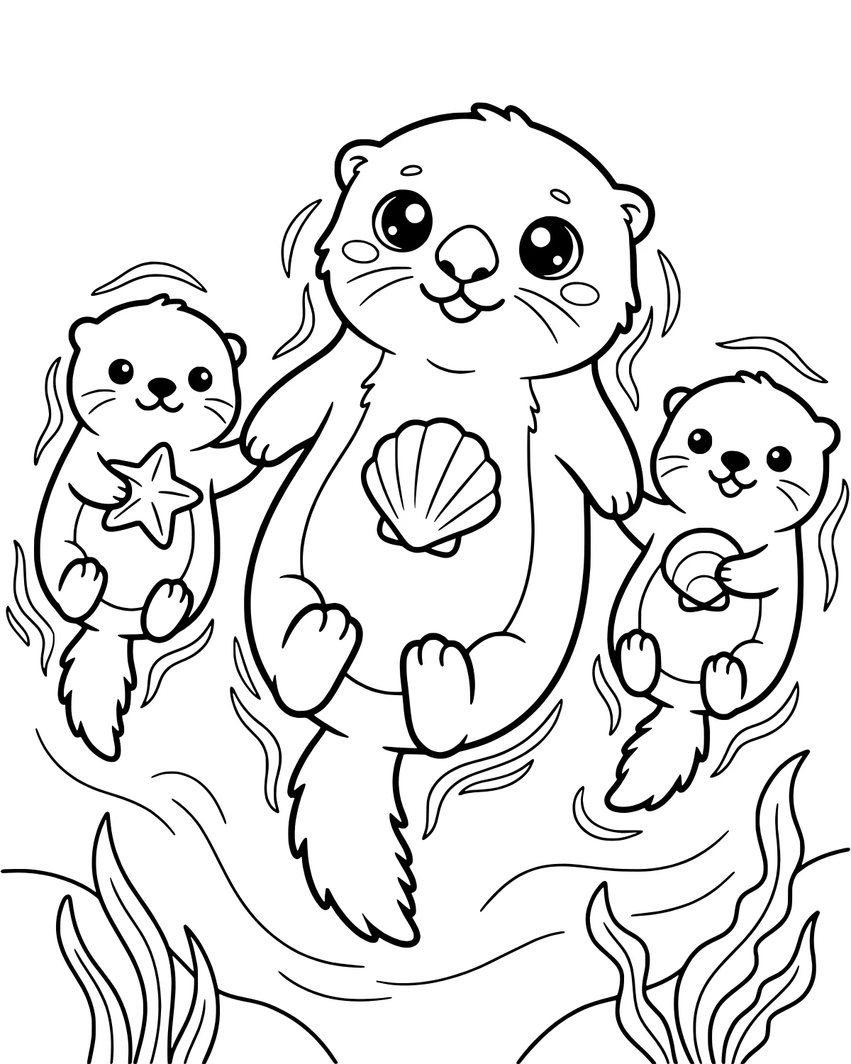 In the middle of the page, the largest otter floats comfortably on its back with a large sea shell tucked safely on its tummy. To the left, another cute otter carefully holds a starfish with five points, showing off its prickly ocean friend. On the right side, a third otter joins the group while clutching its own small shell.