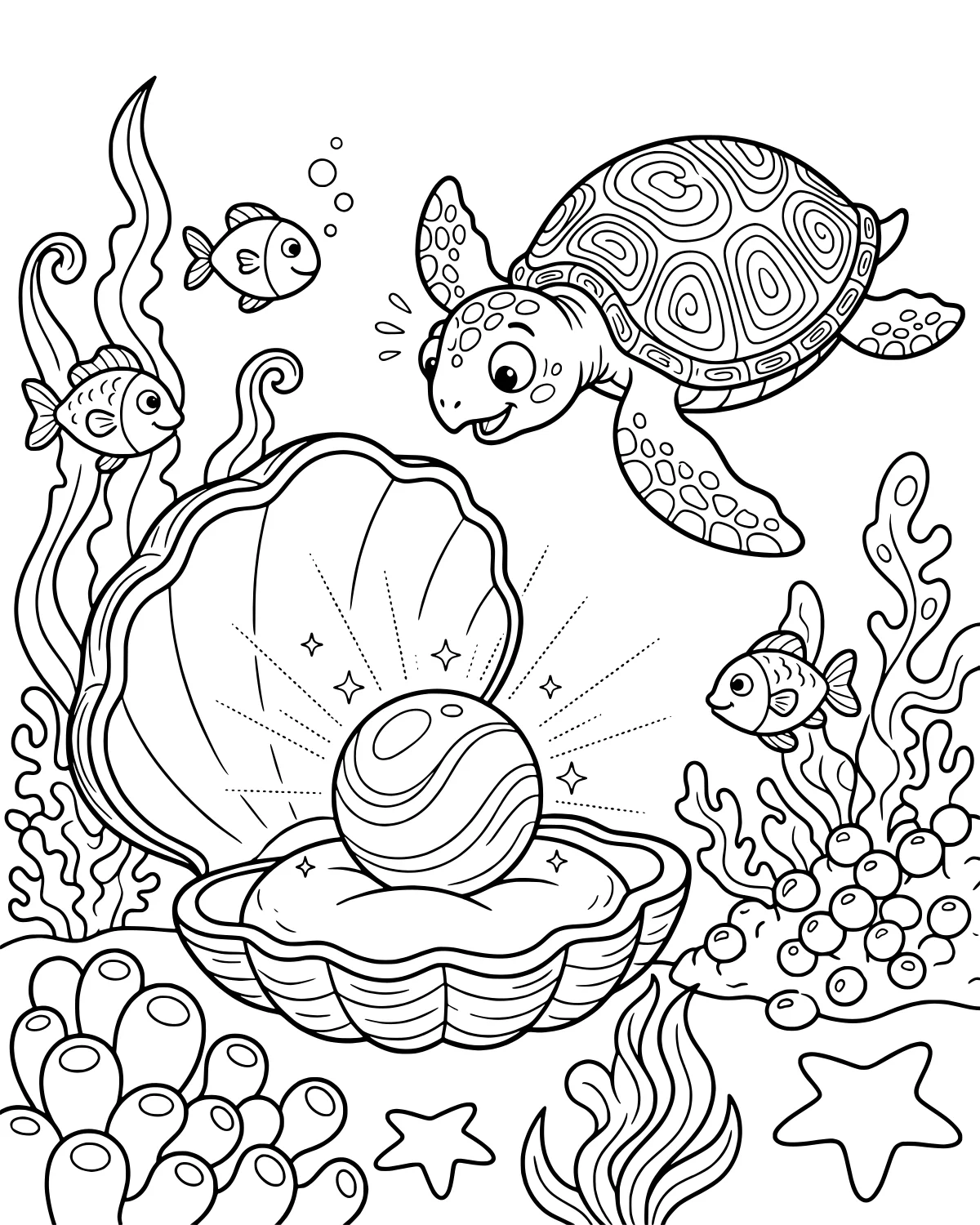 This charming scene features a friendly sea turtle gliding through the deep blue ocean. It seems to have discovered a secret treasure hidden among the coral. A giant clam shell sits wide open on the sandy floor, revealing a glowing luminous pearl that lights up the surrounding water. It is a moment of pure magic and discovery under the waves. Kids will love bringing this peaceful aquatic world to life with their favorite colors while imagining the turtle's journey through the reef.