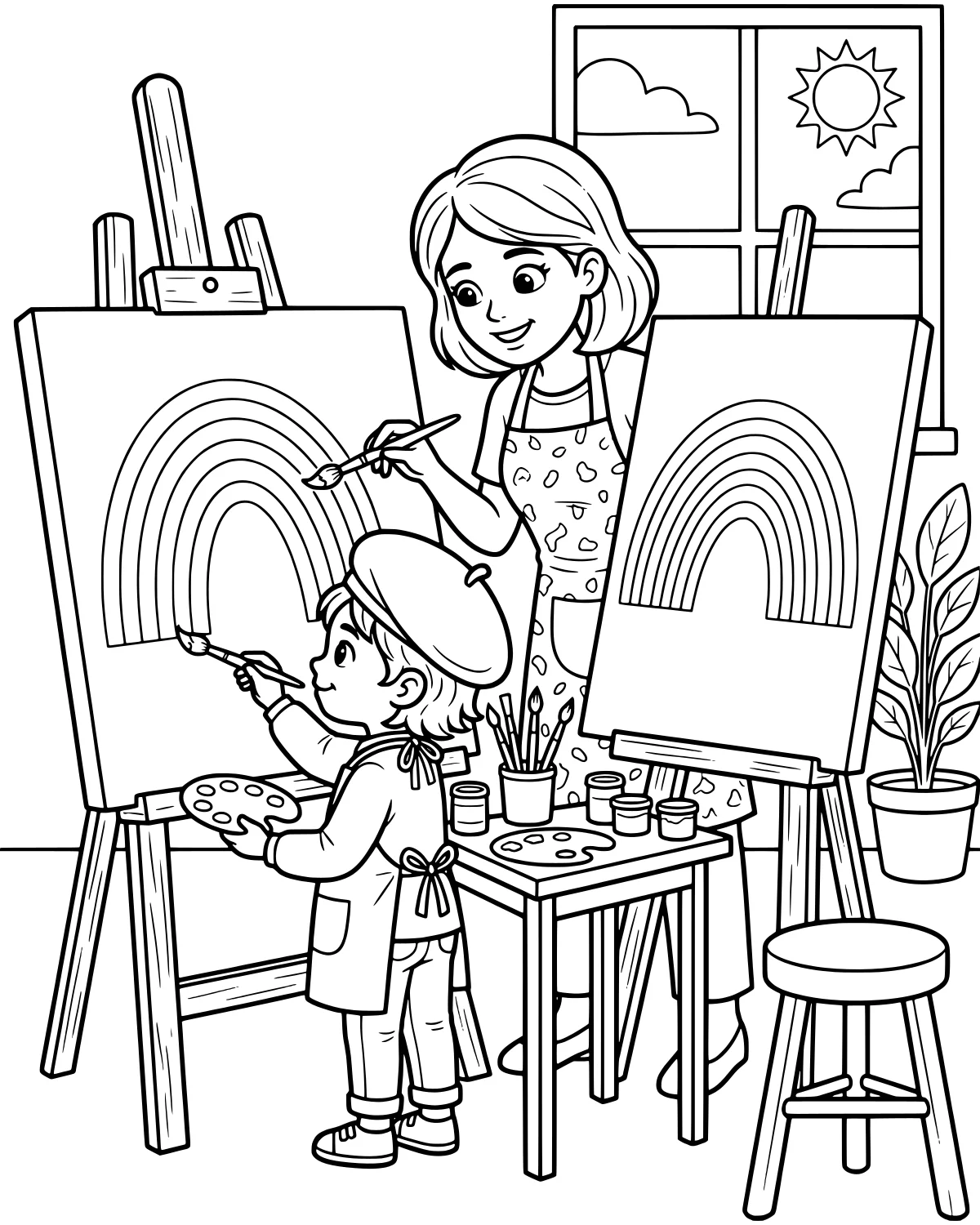 Working on this page allows you to explore a variety of textures and settings. From the smooth wood of the easel to the soft leaves of the potted plant, there is plenty to keep a young colorist engaged. The presence of the sun and clouds through the window adds a cheerful atmosphere that makes the whole experience feel like a bright, happy afternoon spent indoors.