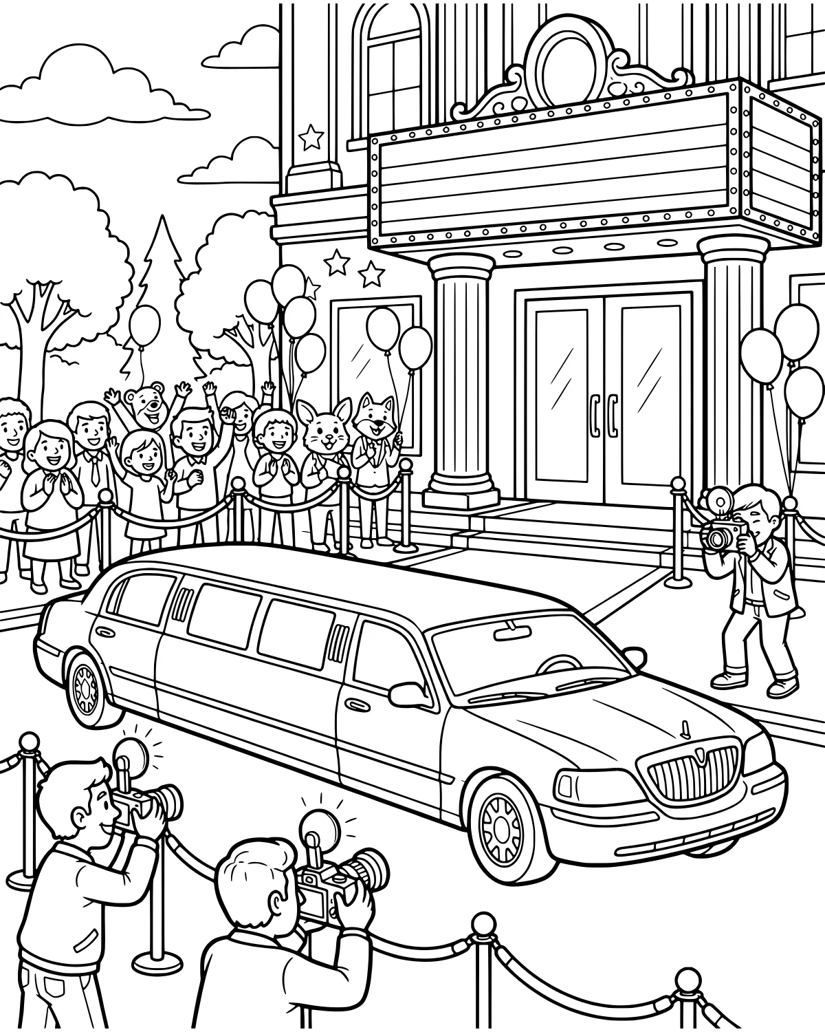 In the center of the scene, a long limousine sits parked next to the red carpet which is held in place by classic stanchions. A grand movie theater stands in the background, featuring tall columns, double doors, and a large marquee ready for a movie title. A friendly fox character, a rabbit, and a teddy bear are joining the fun alongside a group of excited children. High above, balloons float near the clouds and trees, adding to the festive mood. On the sidelines, paparazzi photographers are busy with their cameras, capturing every moment with bright flashes that light up the night.