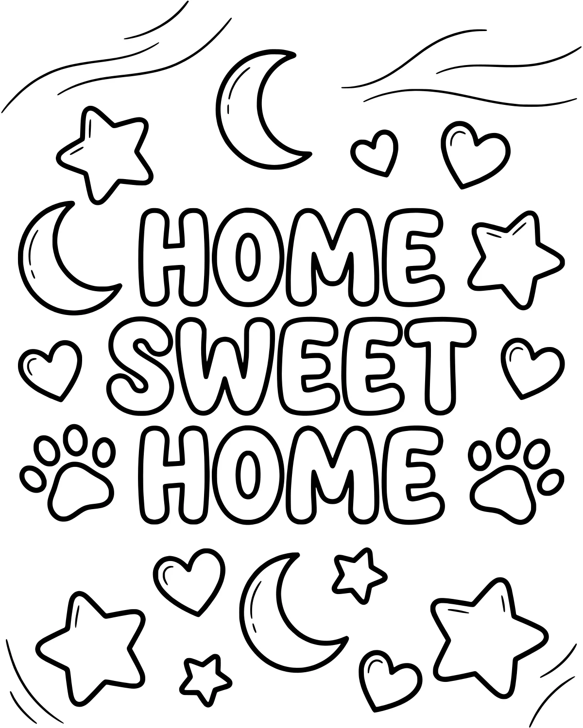 In the center of the page, the bold words Home Sweet Home stand out as the main focus. Surrounding the text, you will find several twinkling stars and delicate crescents that give the scene a magical, nighttime feel. Interspersed among these celestial shapes are small hearts, adding a touch of love and warmth to the design.