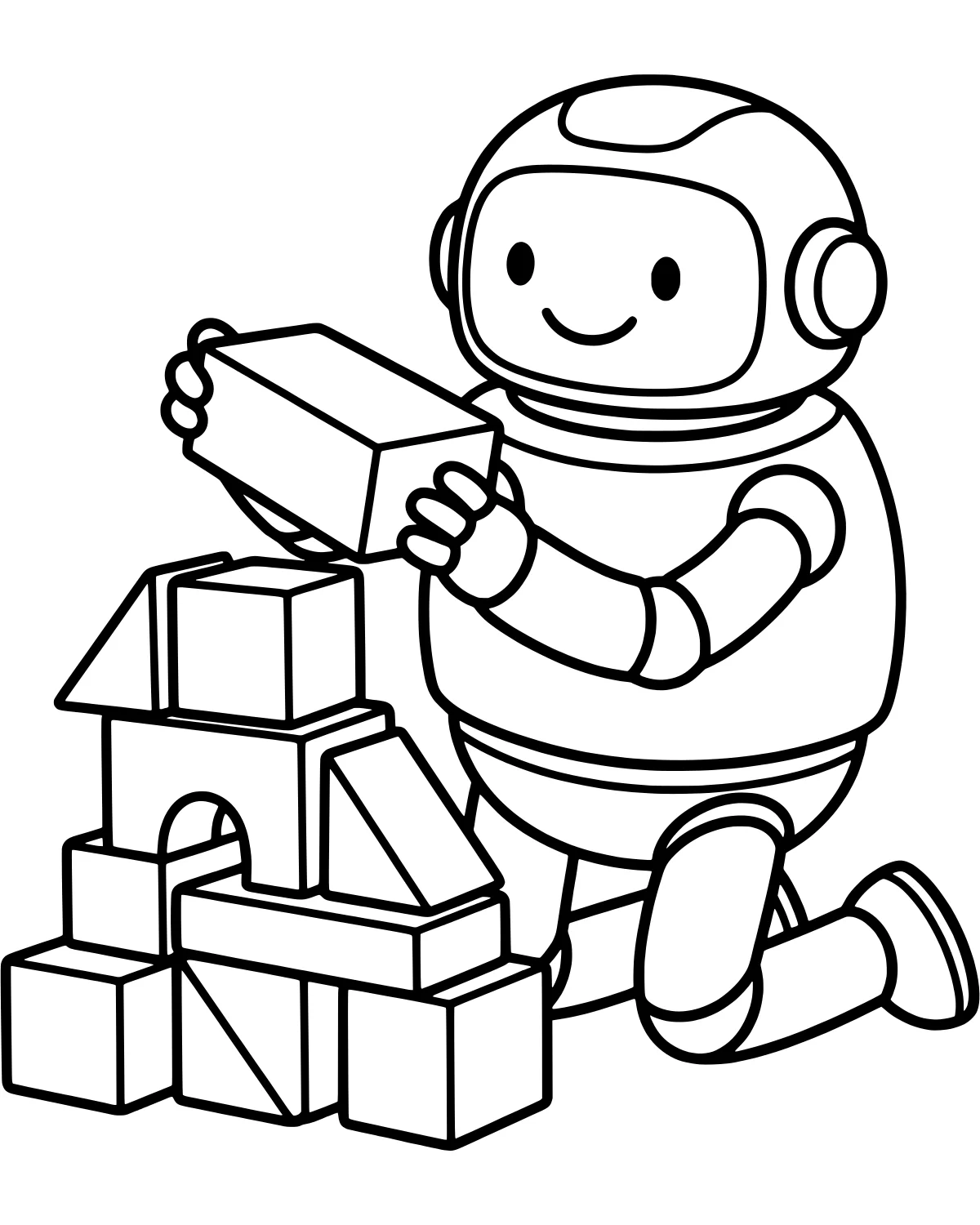 After coloring this page, you can try to recreate the robot's tower using your own building blocks at home. You can also count how many different shapes you find on the page, like the triangles and rectangles, or try to give the robot a name and write a short story about what it is building today.